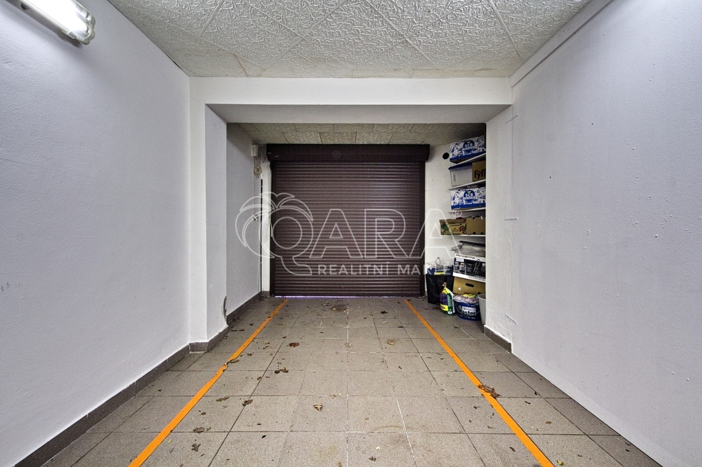 Velkým benefitem bytu je samostatná vytápěná garáž (23,5 m²) s denním světlem, která je přímo propojena s bytem. Tento prostor byl částečně upraven a dnes nabízí chytré rozdělení na garáž a samostatnou pracovnu, která je ideální pro práci z domova, konzultace s klienty nebo kreativní činnost.