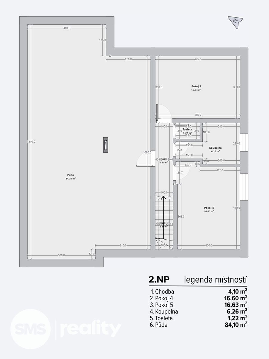 2. NP: chodba, dva pokoje, koupelna, samostatné WC a půdní prostor o ploše 84 m², vhodný k vestavbě dalších pokojů.