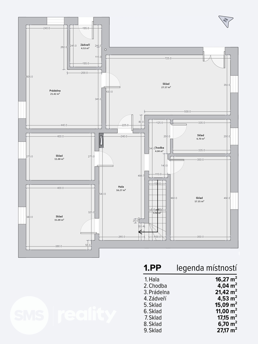 1. PP: hala, chodba, prádelna a několik skladových místností o celkové ploše 123,37 m², vhodných pro dílnu nebo technické zázemí.