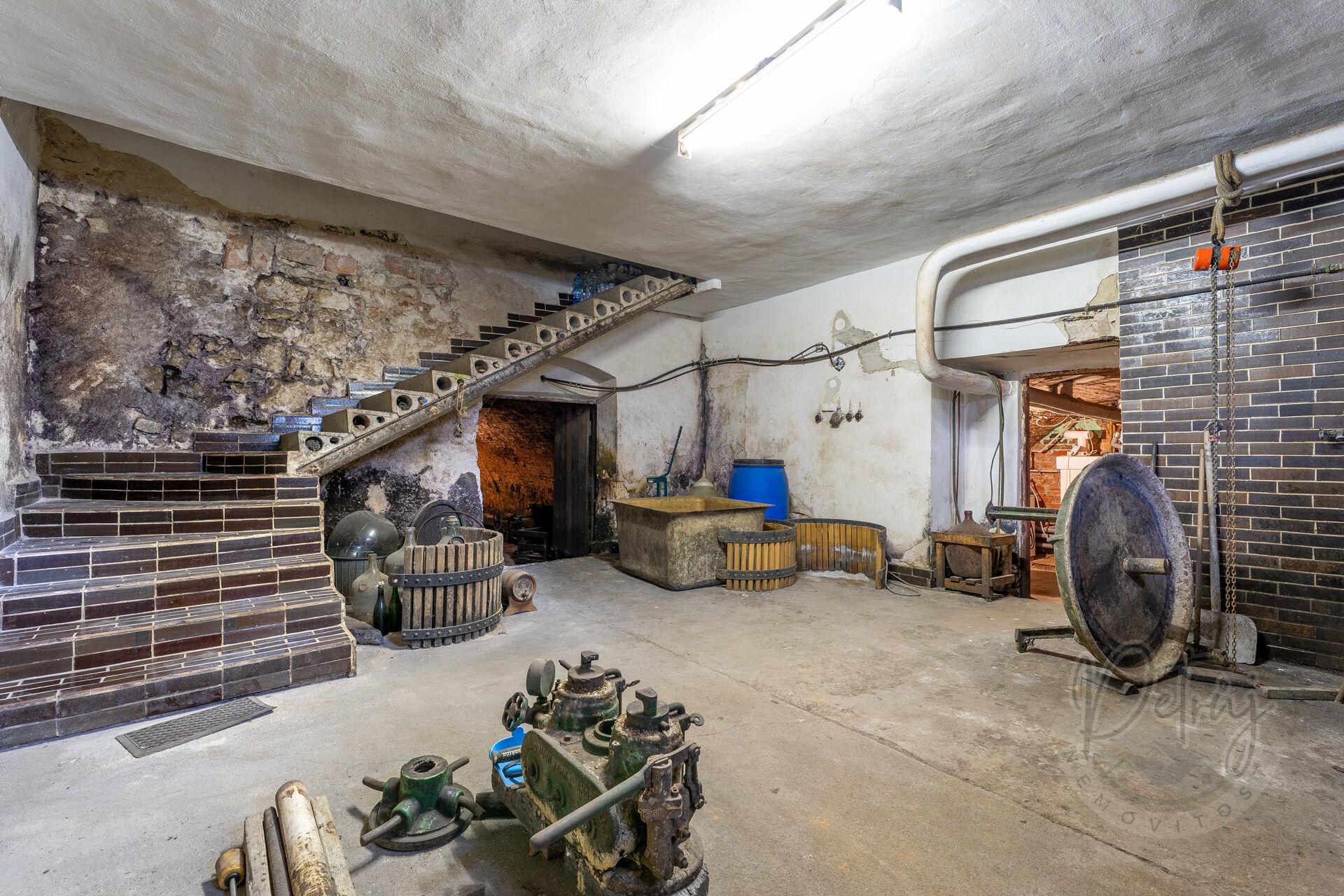 Součástí nemovitosti je prostorná lisovna o ploše cca 36,56 m², která poskytuje ideální zázemí pro zpracování hroznů nebo jiné využití dle potřeb majitele. Na lisovnu navazují dva vinné sklepy – první o velikosti cca 55,47 m² a druhý o ploše cca 27,65 m².