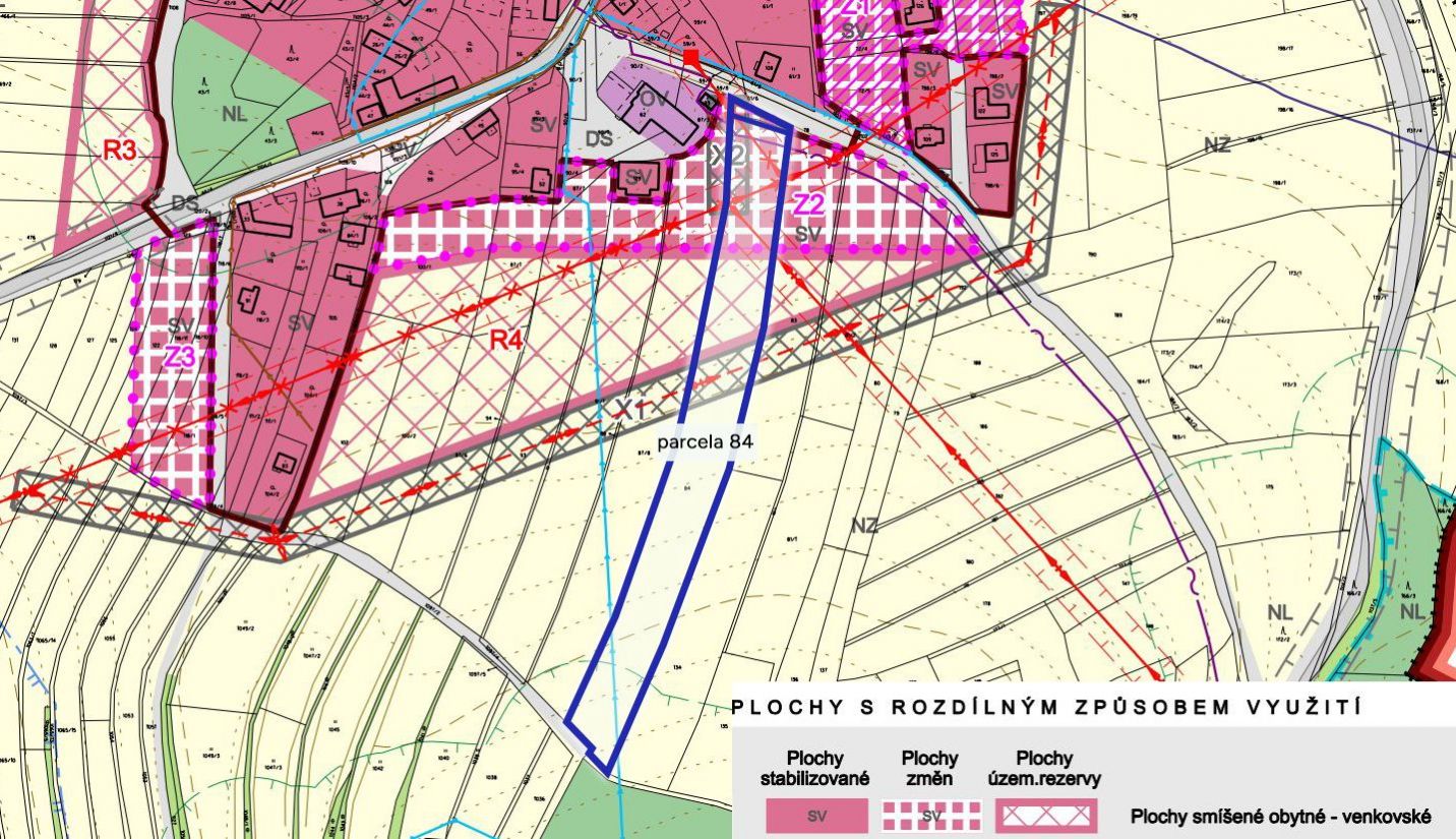 Parcela č. 84 o výměře 9 724 m leží částečně v ploše smíšené obytné venkovské (cca 1 800 m), dále v územní rezervě plochy smíšené obytné venkovské (cca 1 200 m) a ve zbývající části v ploše zemědělské (cca 6 724 m). V západní části je navržena plocha pro koridor technické infrastruktury.