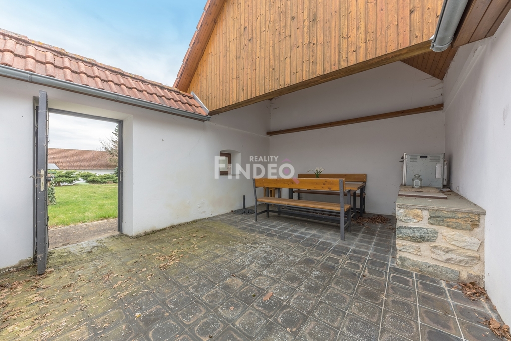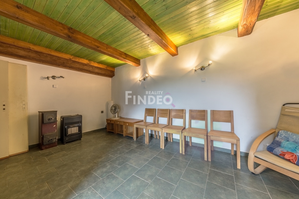 Venkovní zázemí dále rozšiřují praktické přístavky: kryté posezení o ploše 30 m², samostatná společenská místnost (15 m²) a další skladovací prostory včetně půdy nad těmito objekty.