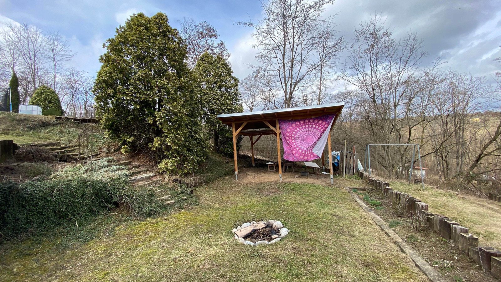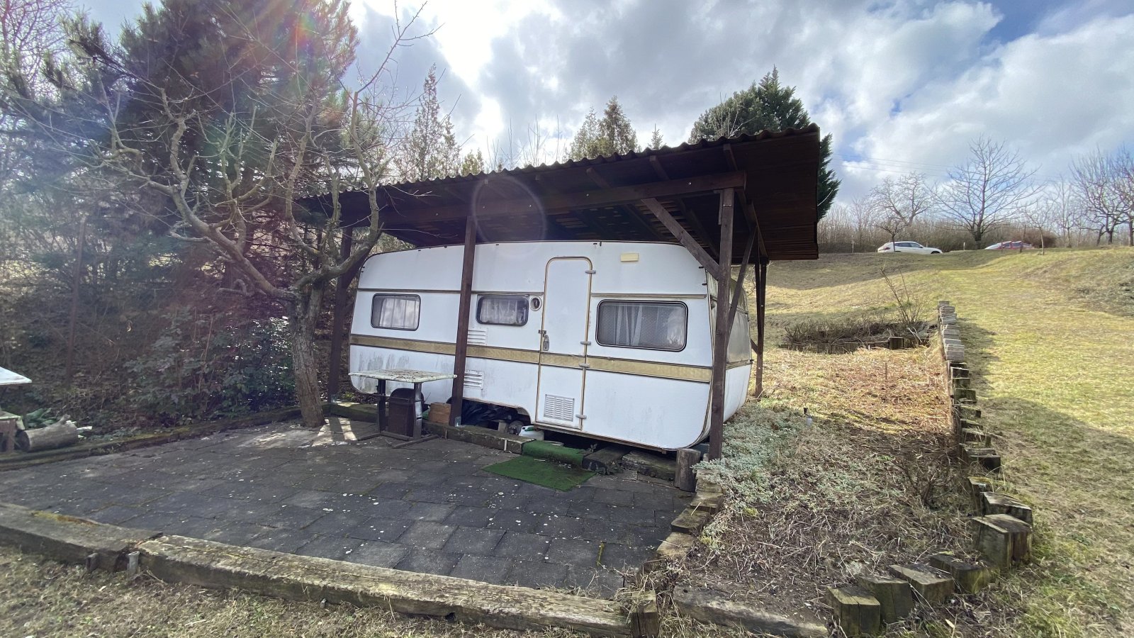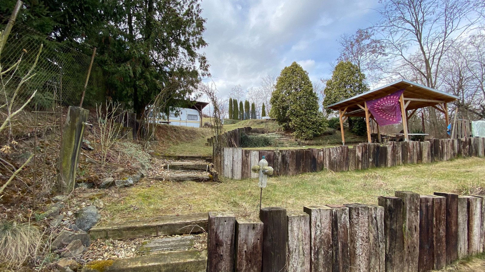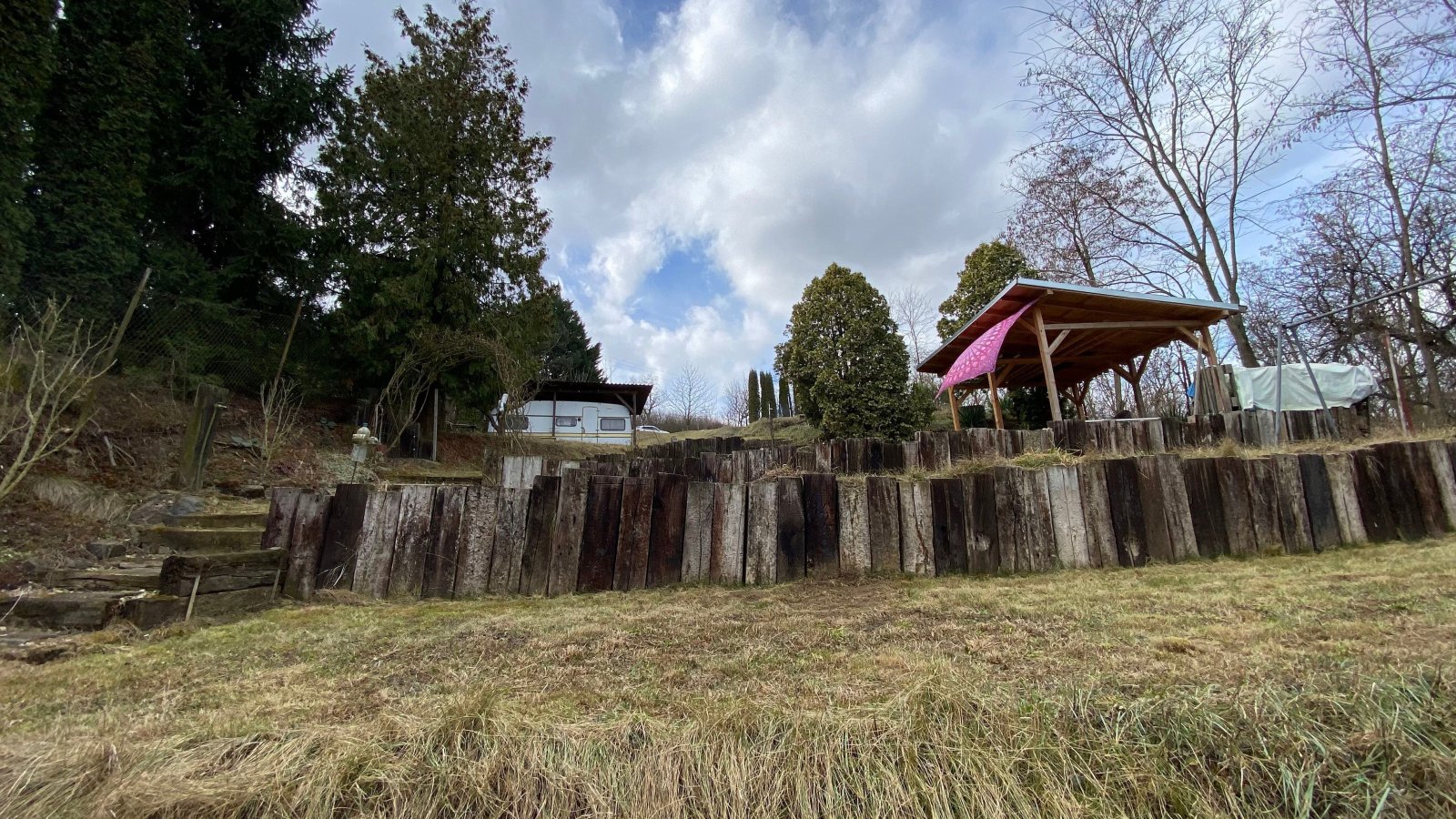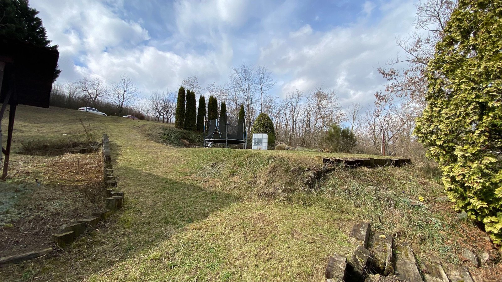Na zahradě se nachází ovocné stromy (15x jabloň, 1x třešeň, 2x višeň, 1x mandloň, 3x meruňka, 6x švestka, 1x ořech), dále jsou zde okrasné dřeviny a terasové skalky. K dispozici je vybavený karavan, zahradní domek na nářadí, suchá toaleta, dvě nádrže na užitkovou vodu, každá s obsahem 3 m3. Voda z nádrží je rozvedena po zahradě a k dispozici je i zahradní sprcha. IS na pozemku nejsou.