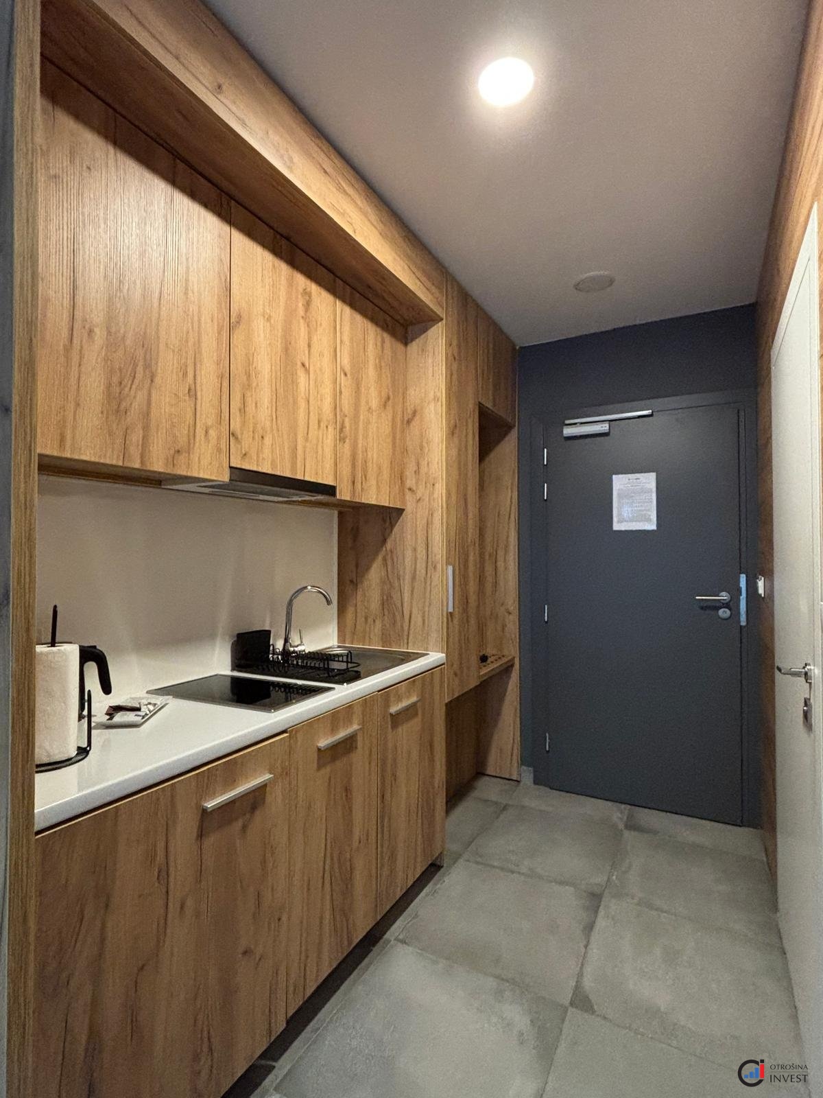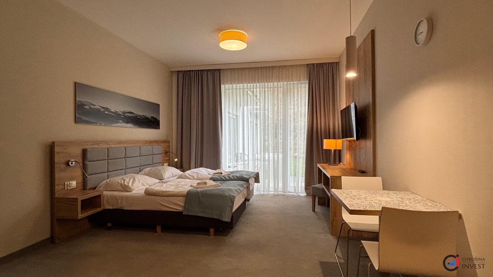Dispozice zahrnuje pokoj s kuchyňským koutem a koupelnu. Z pokoje je vstup na terasu s navazujícím přístupem na zahradu. Apartmán se nachází v přízemí. Nábytek a vybavení jsou součástí ceny.