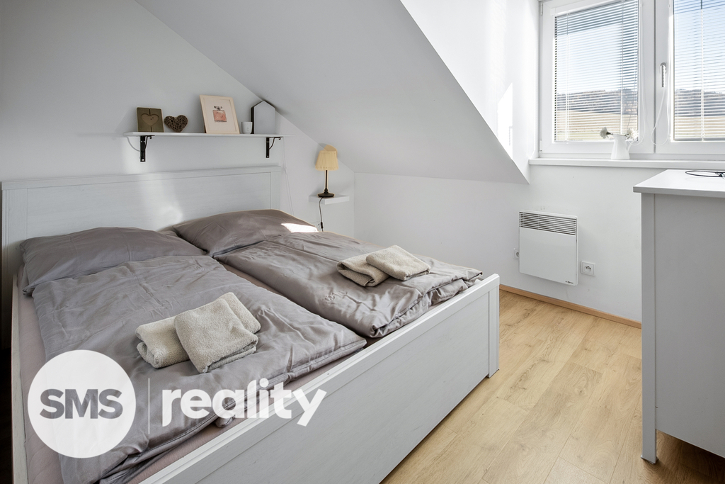 Horní patro nabízí útulnou ložnici a další koupelnu s toaletou a sprchou, což zajišťuje maximální komfort i pro více osob.
