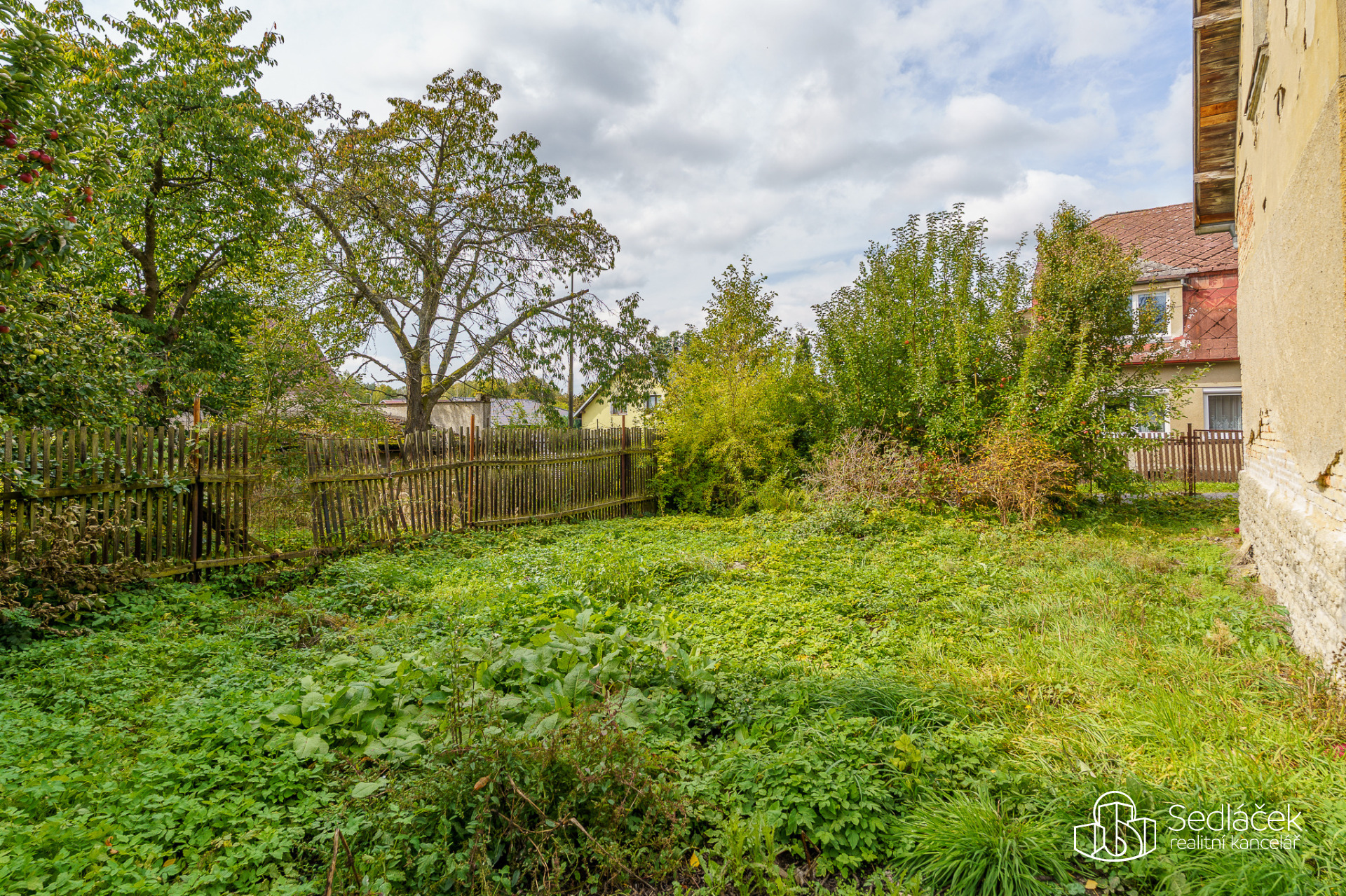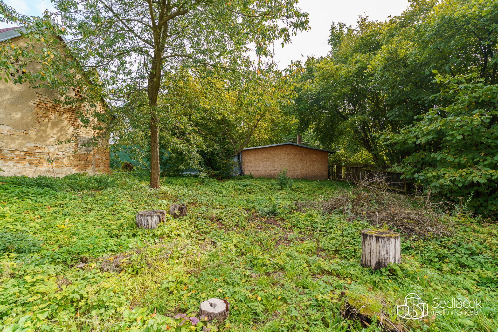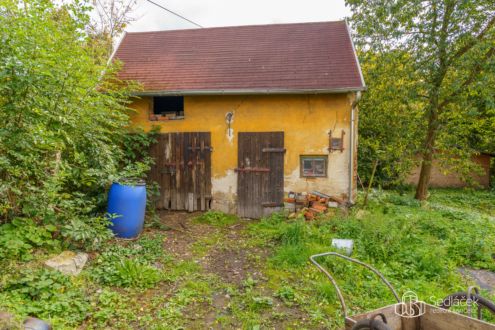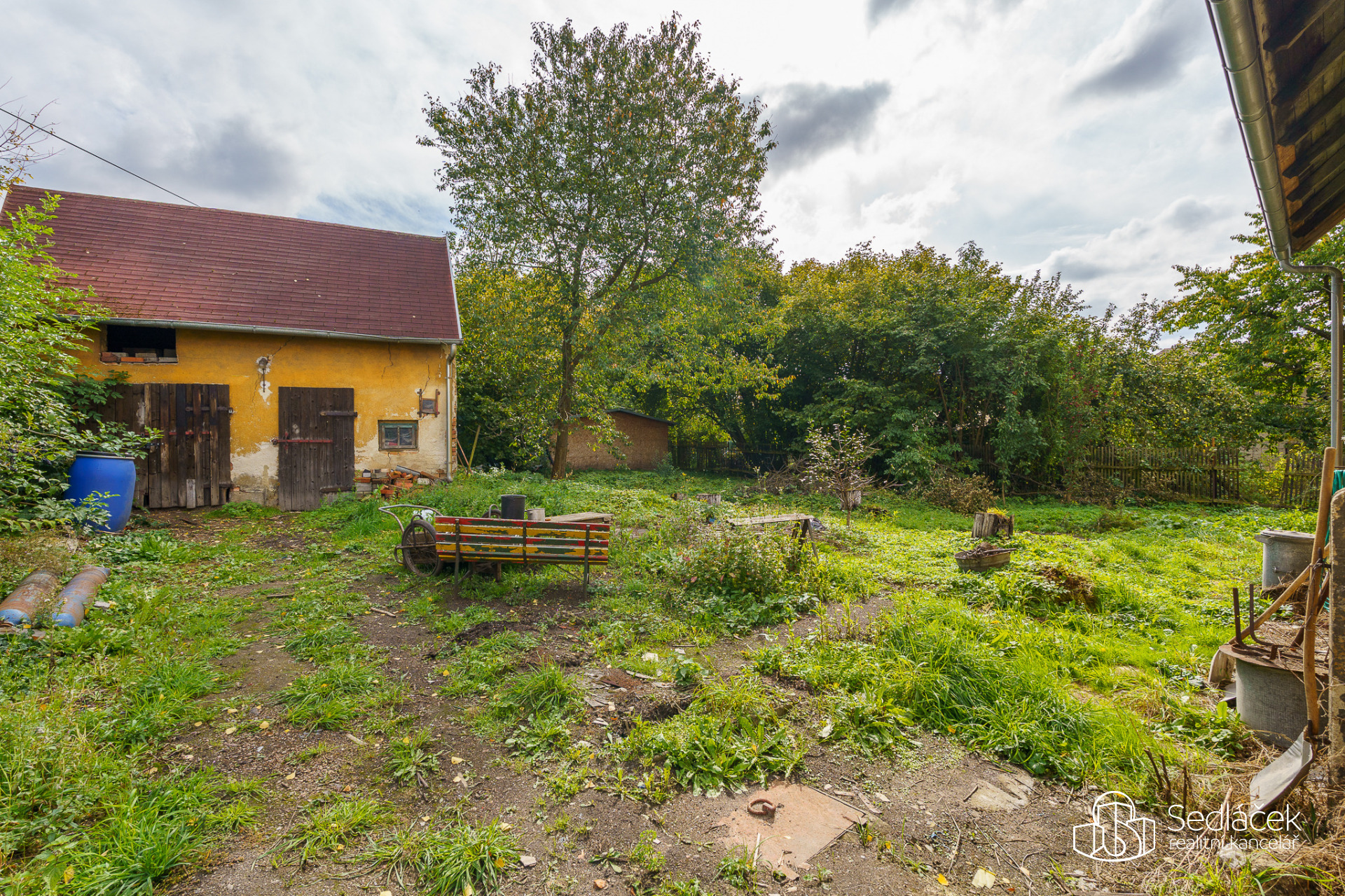 Zahrada je rovinatá, osázená jabloní, a součástí pozemku je i menší hospodářská stavba – ideální jako dílna nebo zahradní sklad.
