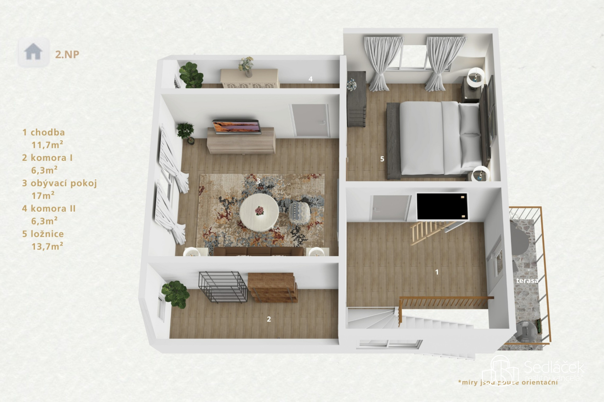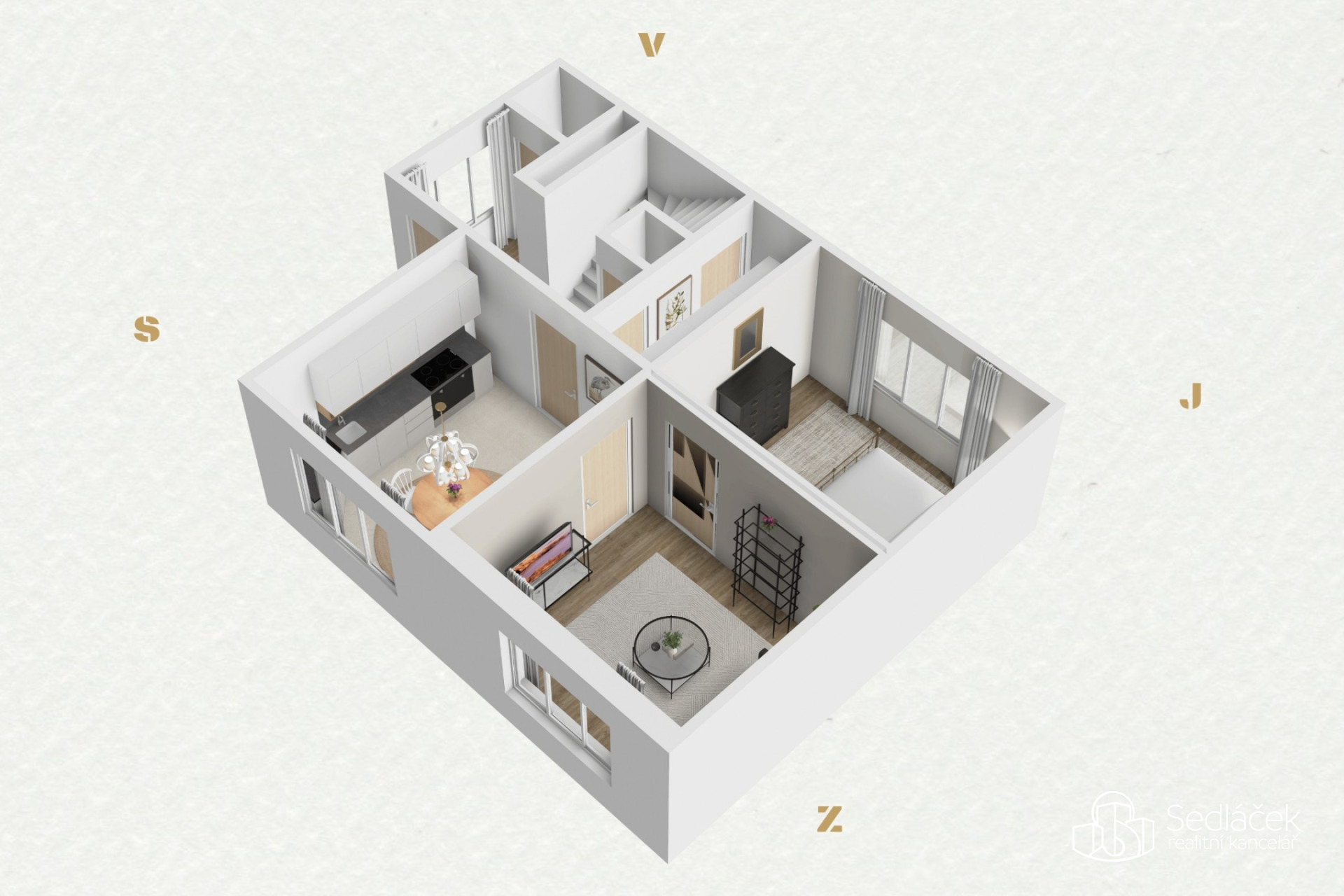 Při rekonstrukci lze dům přestavět na prostorný 3+1 s kuchyní a koupelnou v přízemí, případně přistavět část a vytvořit komfortní 4+1.