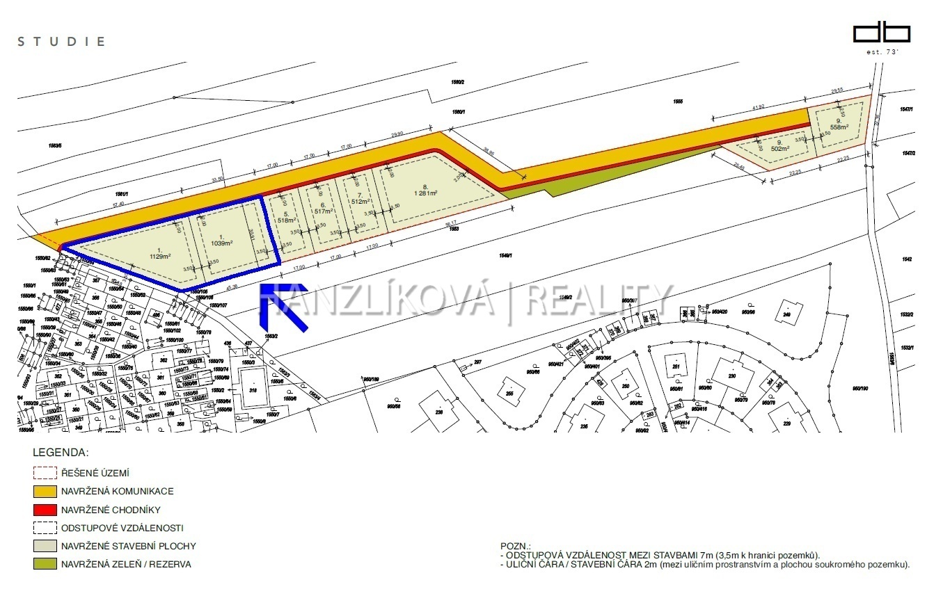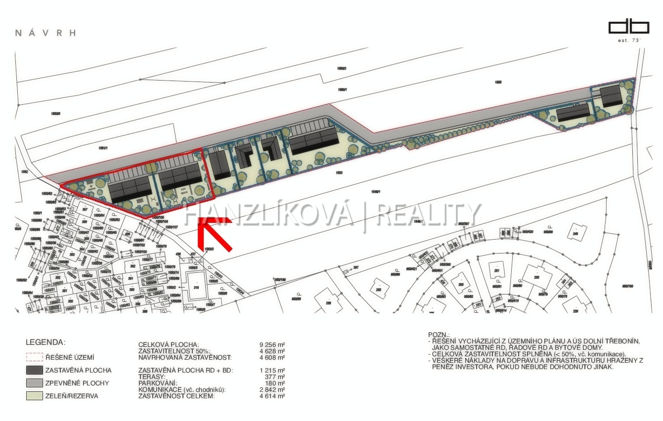 K dispozici je rovněž zpracovaná studie na výstavbu několika třípodlažních bytových domů, která může sloužit jako výchozí podklad pro další projektovou přípravu. Uvedená výměra zahrnuje i přístupovou komunikaci; přesná výměra bude v případě prodeje upřesněna geodetickým zaměřením.