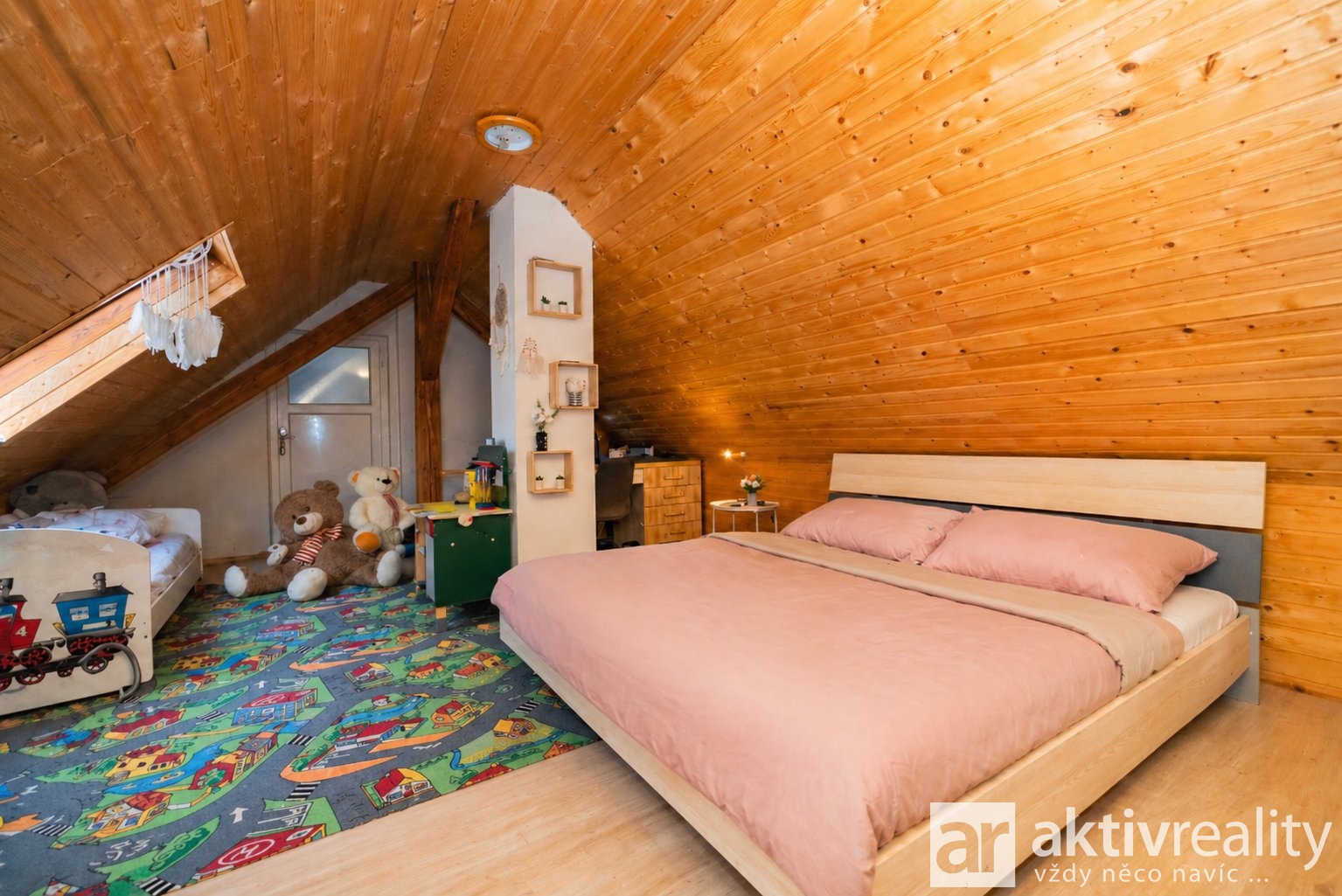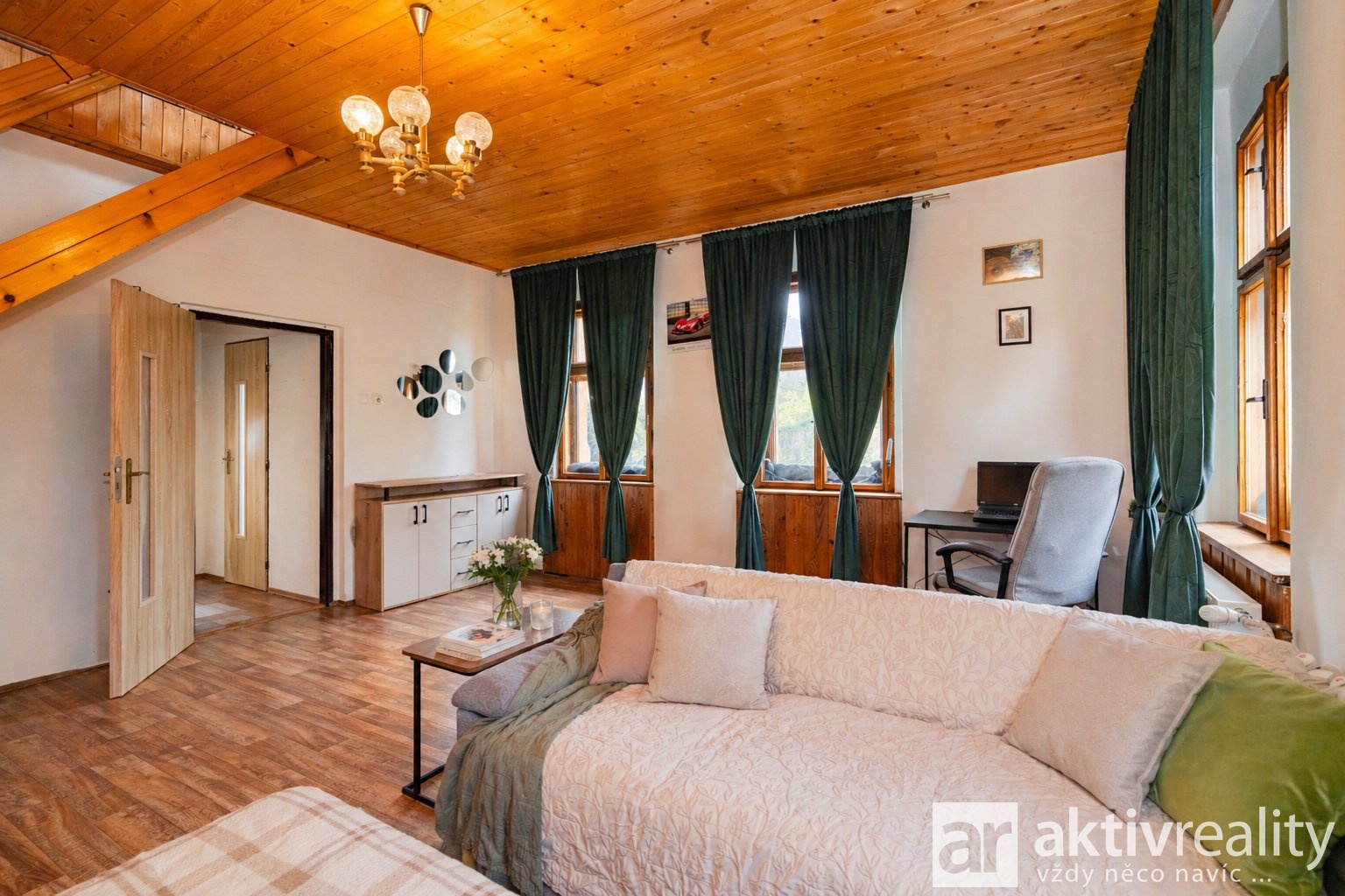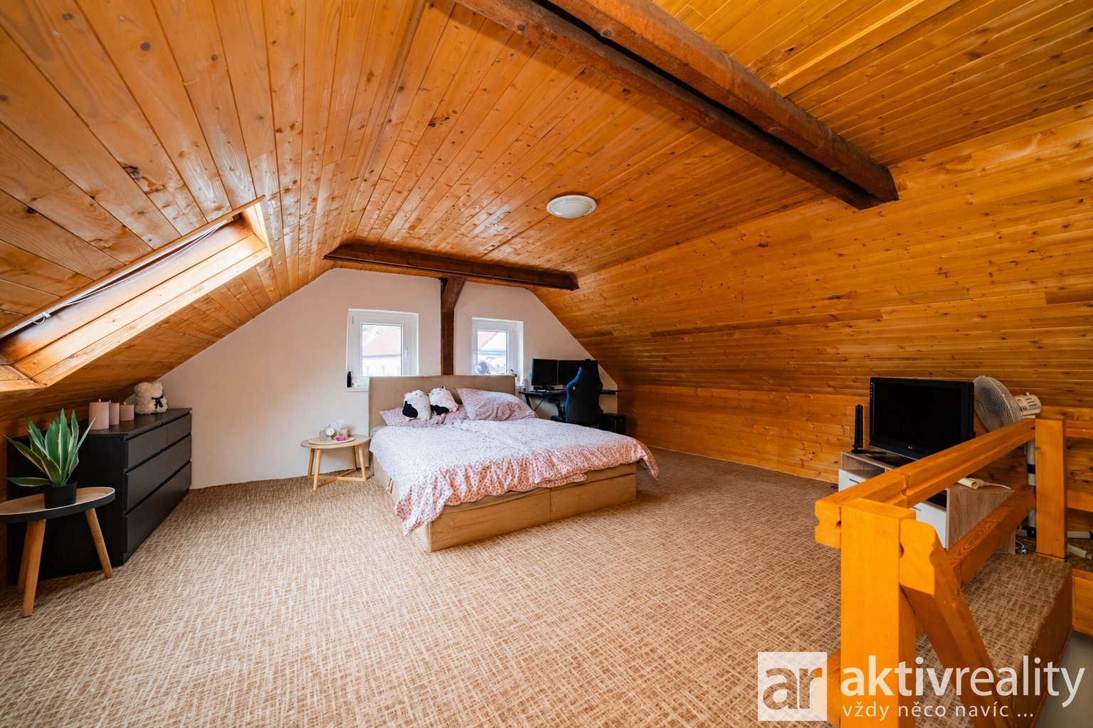 Ložnice v patře má příjemnou atmosféru díky přiznaným dřevěným prvkům. Okna jsou původní dřevěná a do budoucna je vhodné počítat spíše s jejich výměnou.