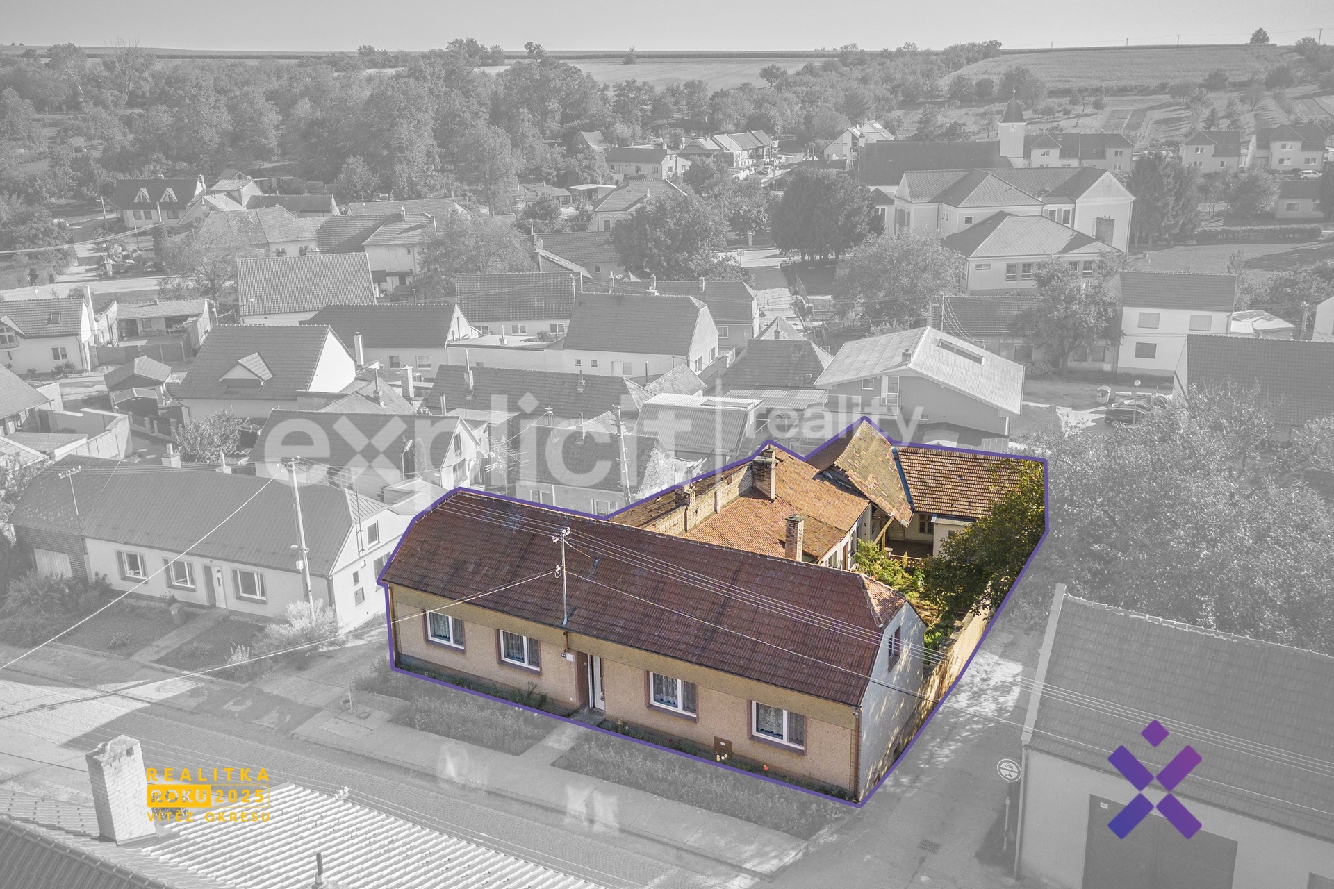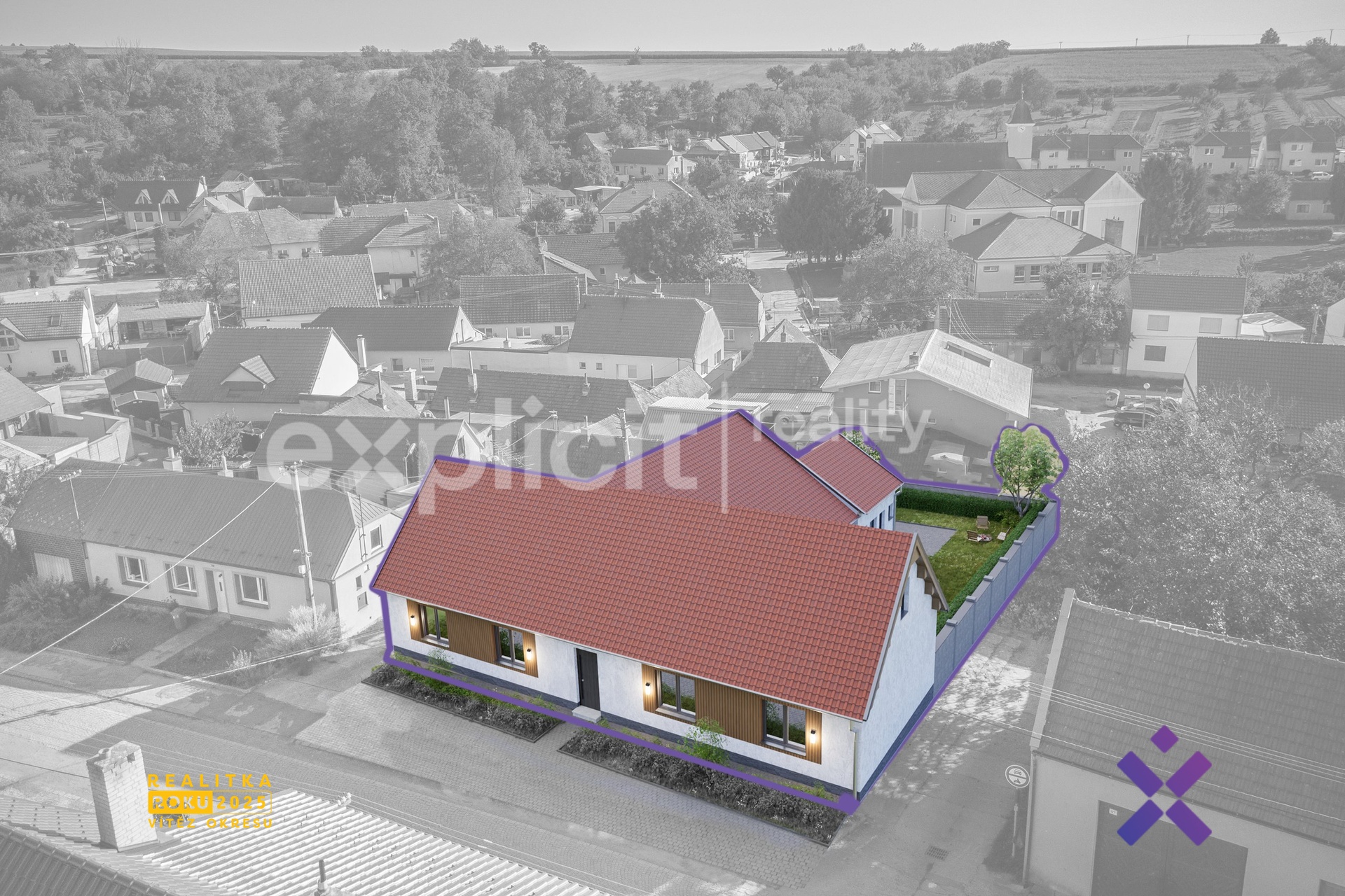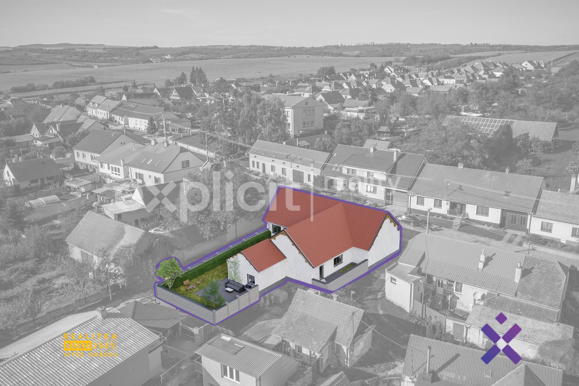 Vizualizace a vyobrazení nemovitosti a pozemku jsou pouze ilustrativní. Závazné údaje o hranicích pozemku jsou uvedeny v katastrální mapě.