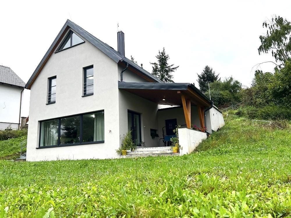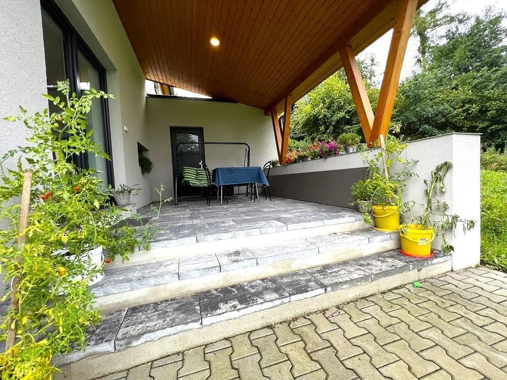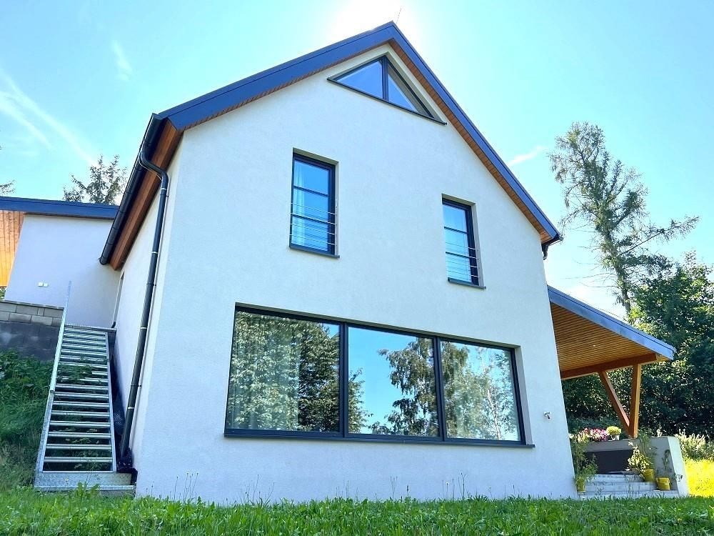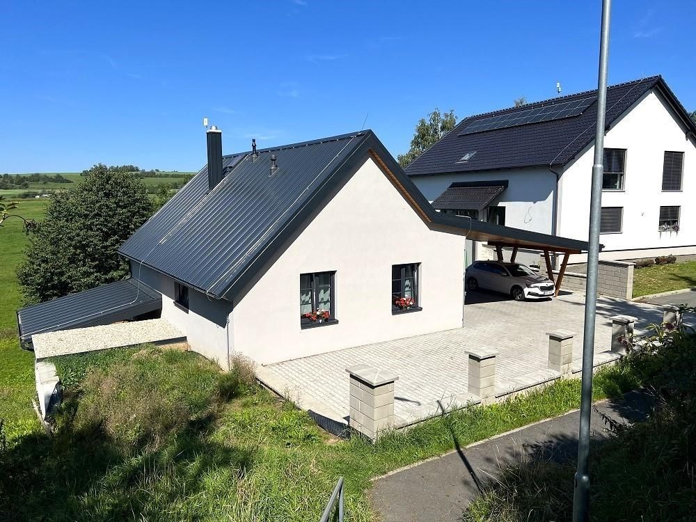 Samostatně stojící objekt nového rodinného domu s kompletním provozním vybavením, přístavbou krytého parkovacího stání, terasou a navazujícím pozemkem - zahradou o celkové výměře pozemků 800 m2. Jedná se o patrový, nepodsklepený rodinný dům zděné konstrukce situovaný ve svažitém terénu s dispozicí obytných prostor o dispozici 4KK ( 4x místnost + kuchyňský kout s jídelnou ) s krytou terasou a příslušenstvím ve dvou nadzemních podlažích o celkové výměře vnitřní užitné plochy cca 164 m2 (přízemí + snížené přízemí). Objekt byl nově zbudován a zkolaudován v roce 2021, následně užíván k trvalému bydlení jako jednogenerační, nízkoenergetický rodinný dům, nyní kompletně provozně vybaven a zařízen s obslužnými nebytovými prostorami, ve velmi dobrém technickém stavu, připraven k okamžitému užívání a bydlení. ENB: třída „B“. Navazující pozemek, částečně oplocená zahrada se zpevněnými venkovními úpravami, krytým parkovacím stáním pro dva automobily, venkovní manipulační plochou, venkovním schodištěm a travním porostem je situována ve svažitém terénu s orientací klidové části pozemku na severozápad. Pozemek je dostupný vlastní vjezdovou bránou a vstupem jako poslední (krajní) pozemek, tj. nejlépe situovaný pozemek v nově zbudované obytné rezidenční lokalitě s okolními novostavbami rodinných domů. Lokace nemovitostí v klidné, severozápadní části města Domažlice s navazující veřejnou zelení a výhledem do otevřené krajiny. Nabízené nemovitosti jsou jako celek vhodné a využitelné k trvalému rodinnému bydlení s nadstandardními prostorami k parkování automobilů, v klidné okrajové části města s dobrou dopravní dostupností, kompletními službami a infrastrukturou ve vyhledávané, rezidenční části historického okresního města Domažlice s kompletní občanskou vybaveností. Předností nabízených nemovitostí je velmi dobrý technický stav (nízkoenergetická novostavba) objektu RD, kompletní technická a provozní vybavenost objektu RD, nadstandardní lokace nemovitostí a umístění v okrajové rezidenční zástavbě s okolní veřejnou zelení, velikost a vnitřní dispozice rodinného domu, energetická nenáročnost objektu, velikost navazujícího pozemku a samotná lokalita okresního historického města Domažlice s kompletní vybaveností. Dispozice RD: přízemí - vstup, předsíň se šatnou, chodba se schodištěm, 3x ložnice, koupelna s WC a technickým zázemím. Snížené přízemí - schodiště, chodba, obytná místnost s jídelnou, kuchyňský kout, komora, WC s umývárnou, krytá terasa, venkovní skladovací sklepní prostor. Podkroví - volný půdní prostor s možností zbudování a rozšíření obytných prostor. Přístup z veřejné asfaltové komunikace a chodníku, vjezd + vstup, elektřina (220/380V), napojeno na veřejný vodovod, odkanalizováno do veřejné splaškové kanalizace, napojeno na rozvod plynu a telekomunikační rozvody. Vytápění objektu: centrální plynové - podlahové. Zastavěná plocha RD: 142 m2, užitná plocha RD: cca 164 m2, plocha pozemků celkem: 800 m2.
