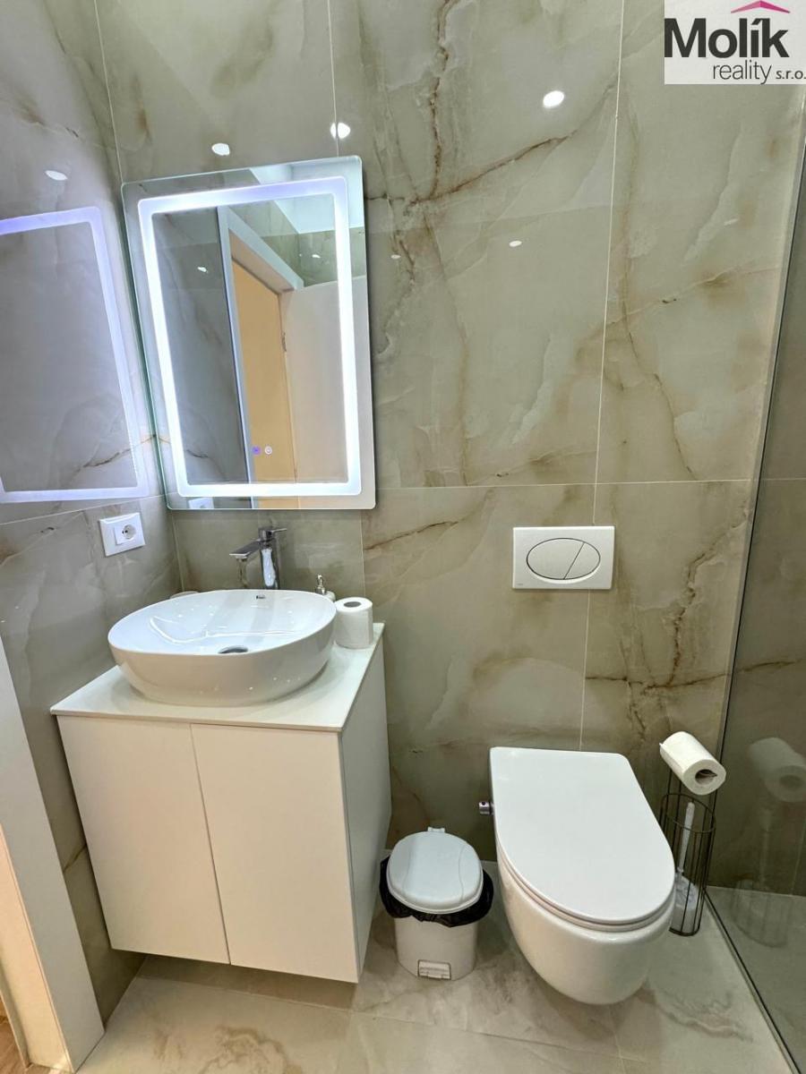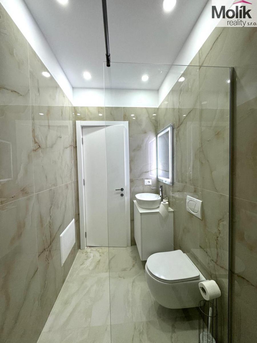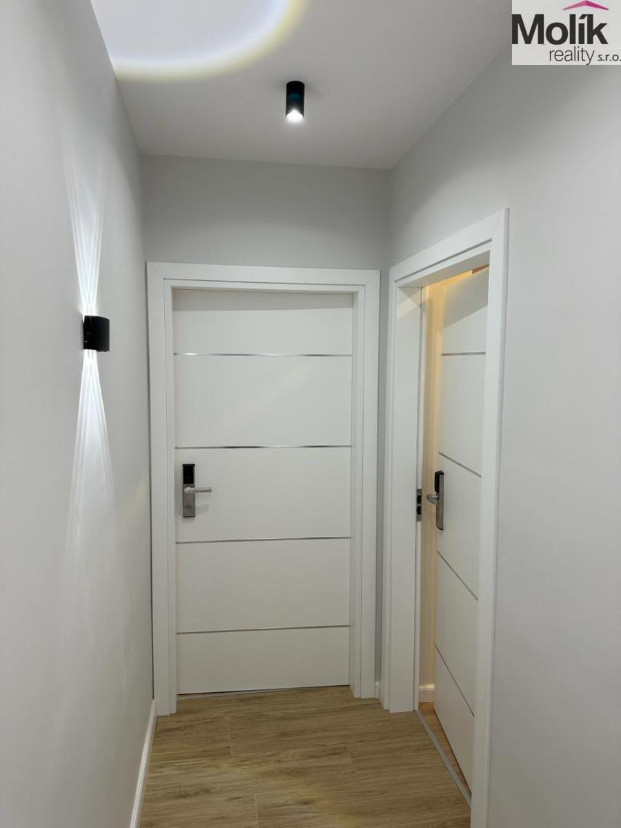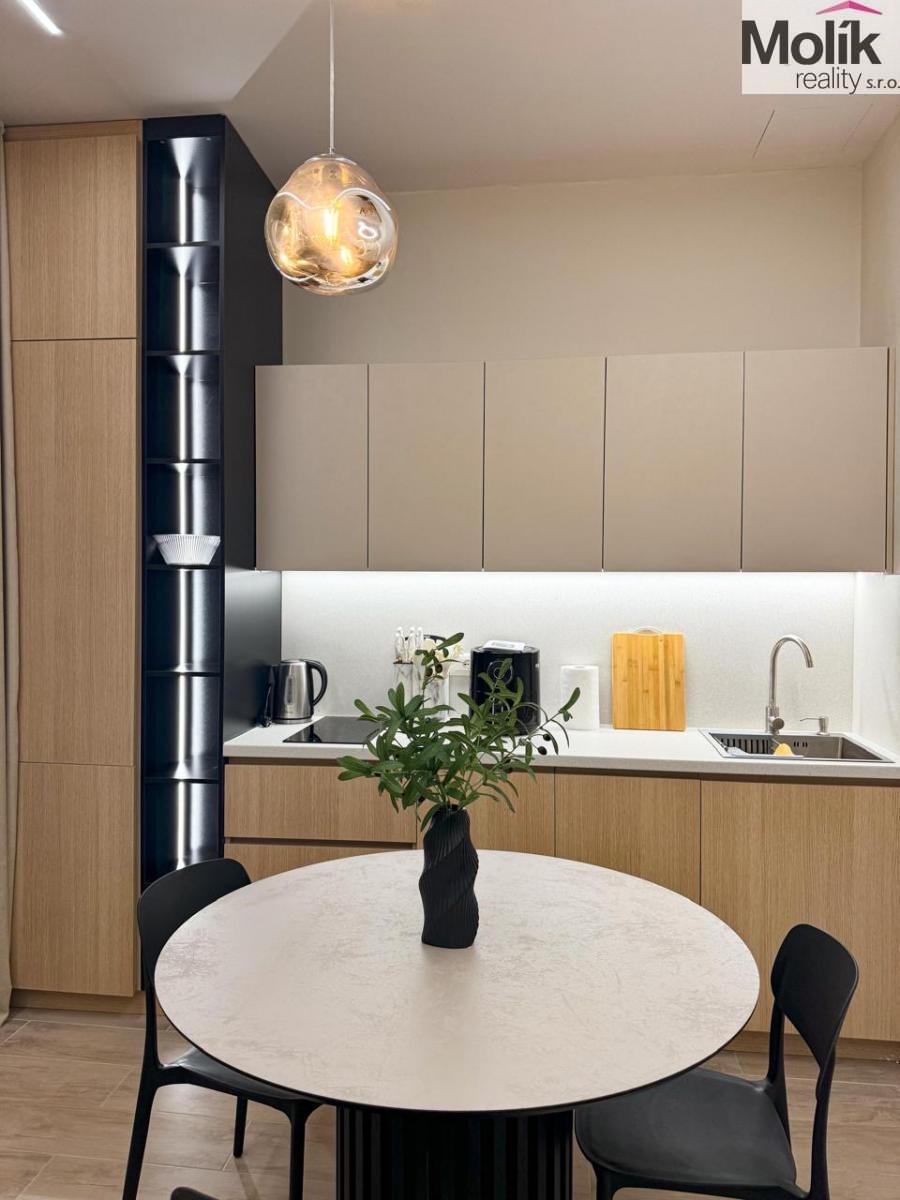 Vybavení: Designová TV stěna s mramorovým dekorem, stylový jídelní kout, ložnice s prémiovou šatní stěnou a integrovaným LED podsvícením.