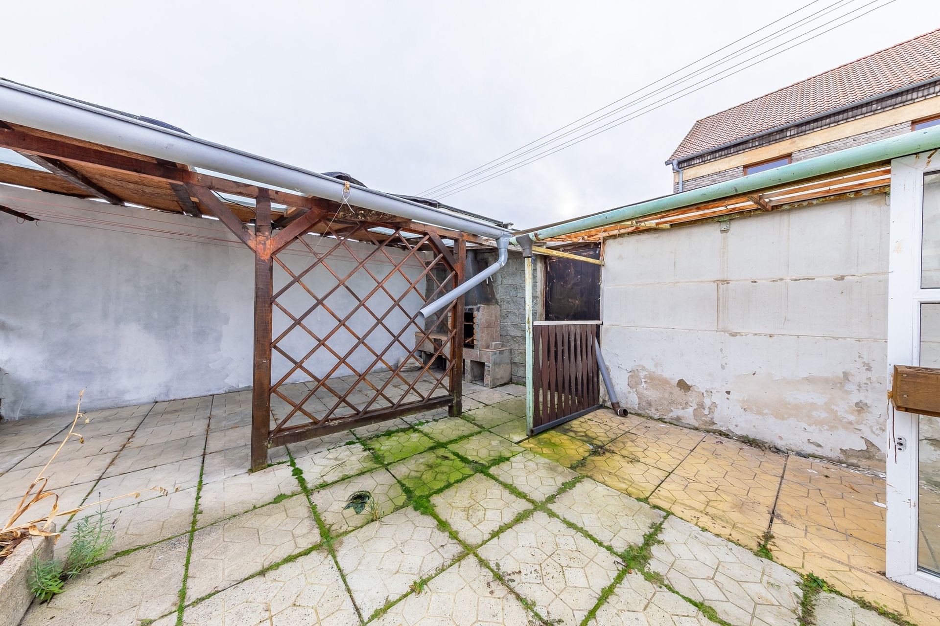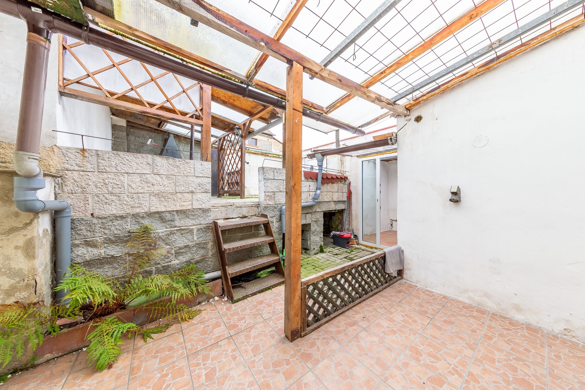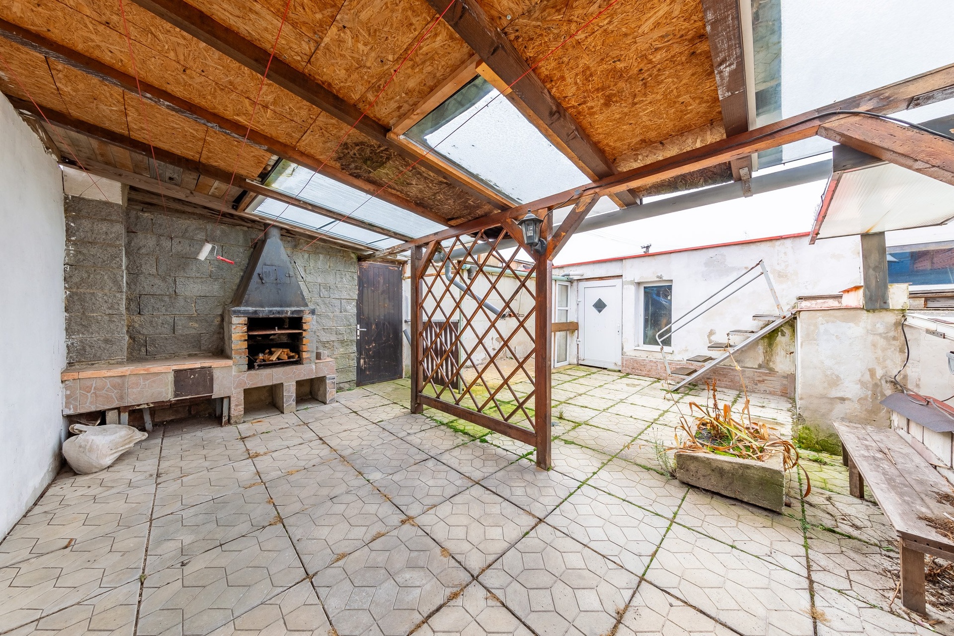 Venkovní posezení na dvorku, dílna (garáž) v zadní části domu.