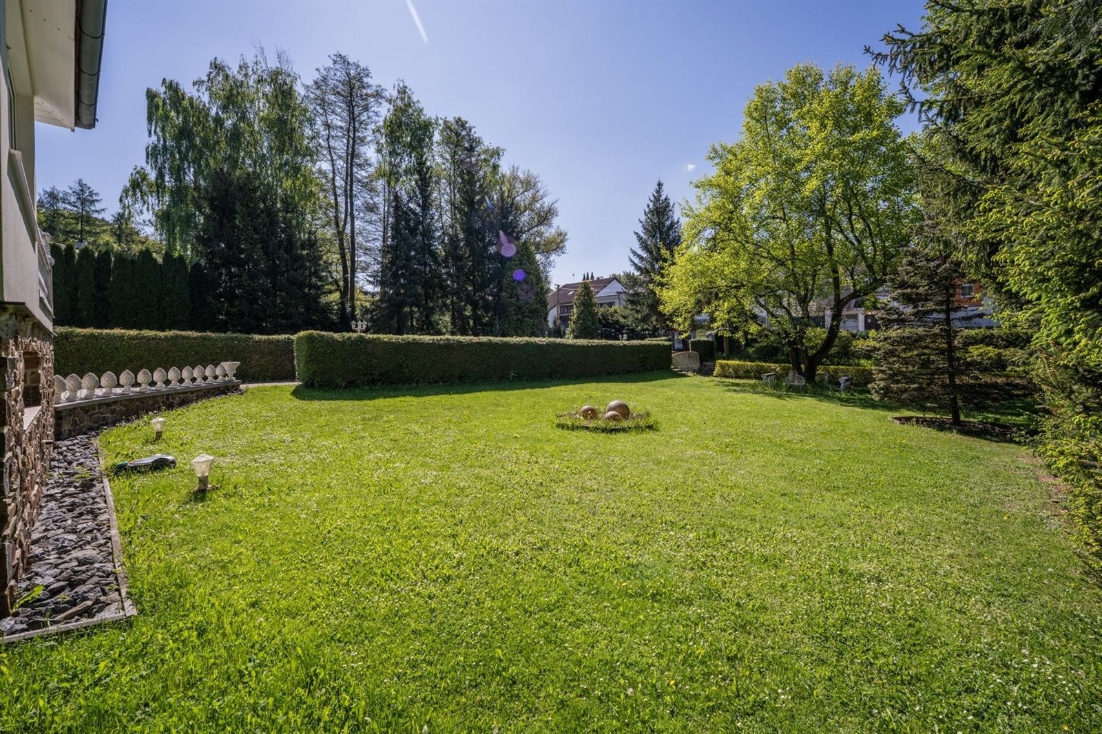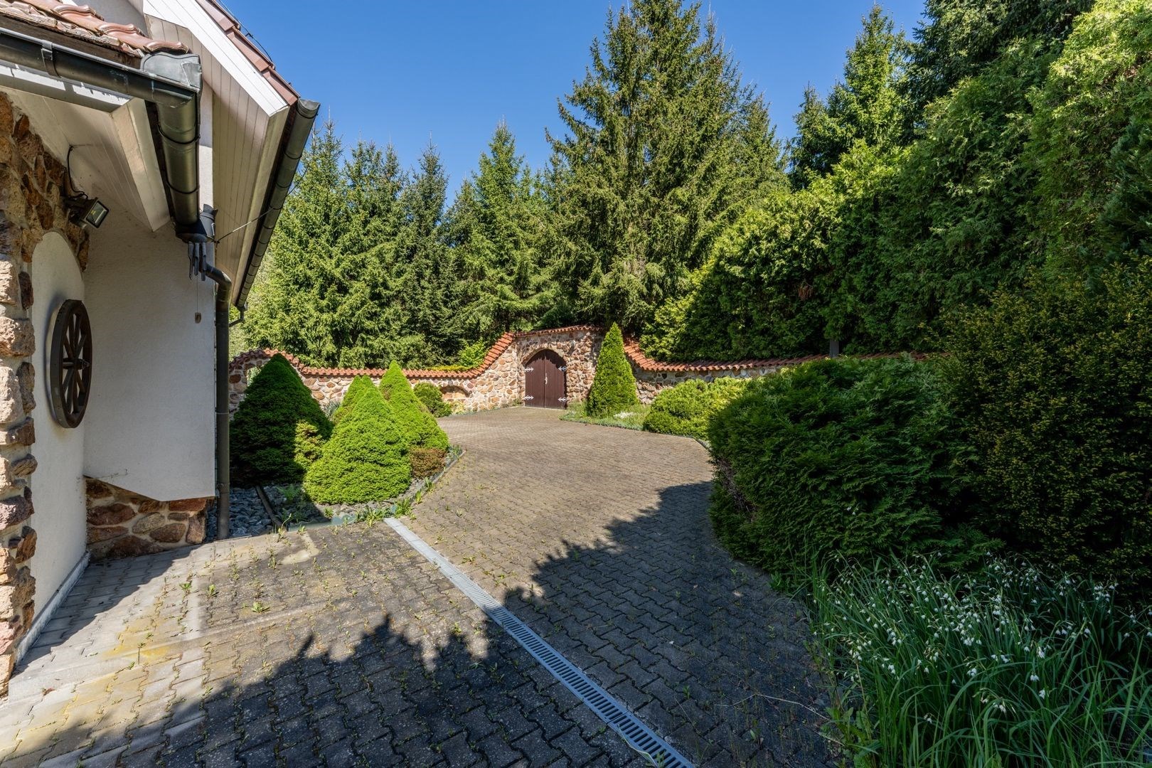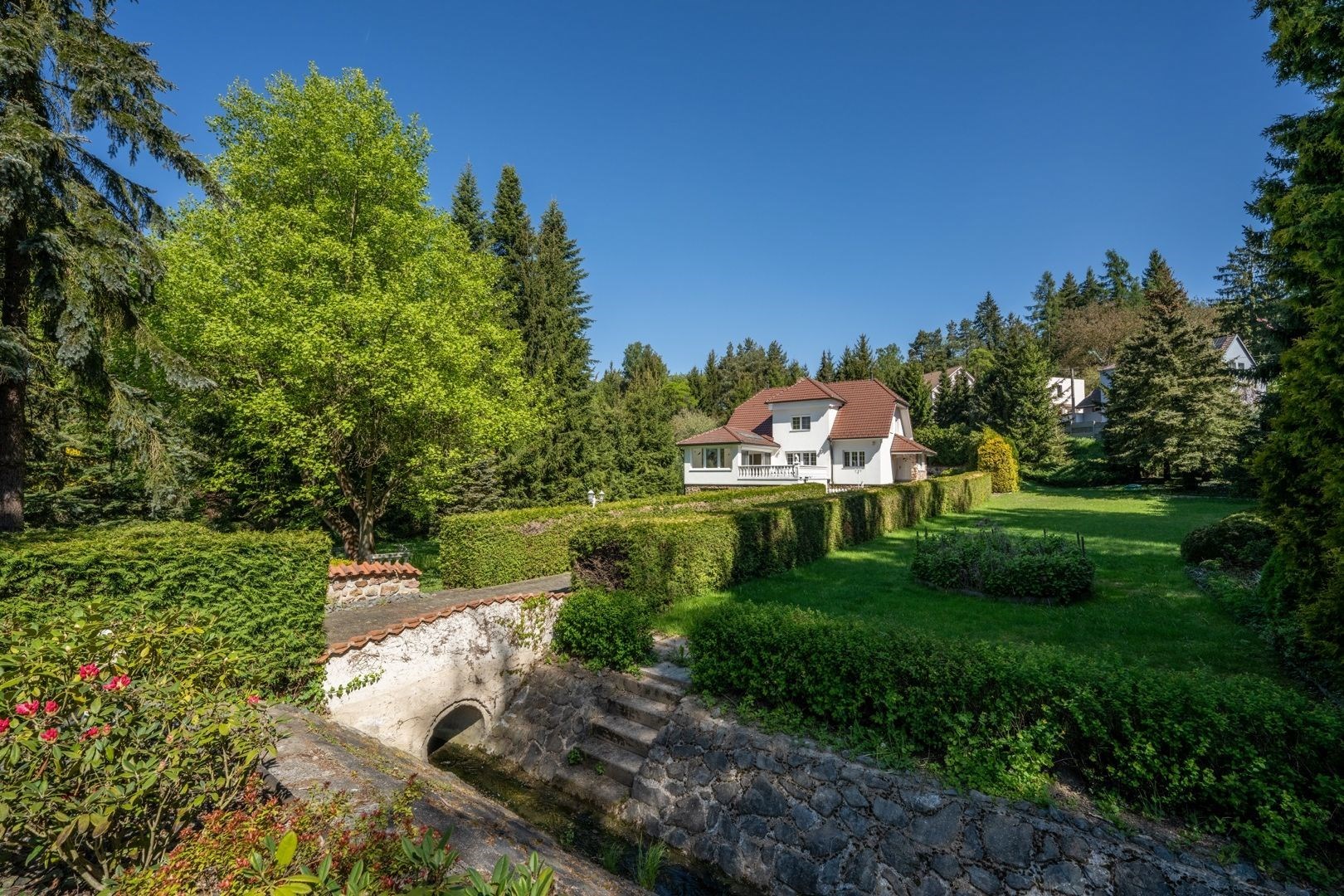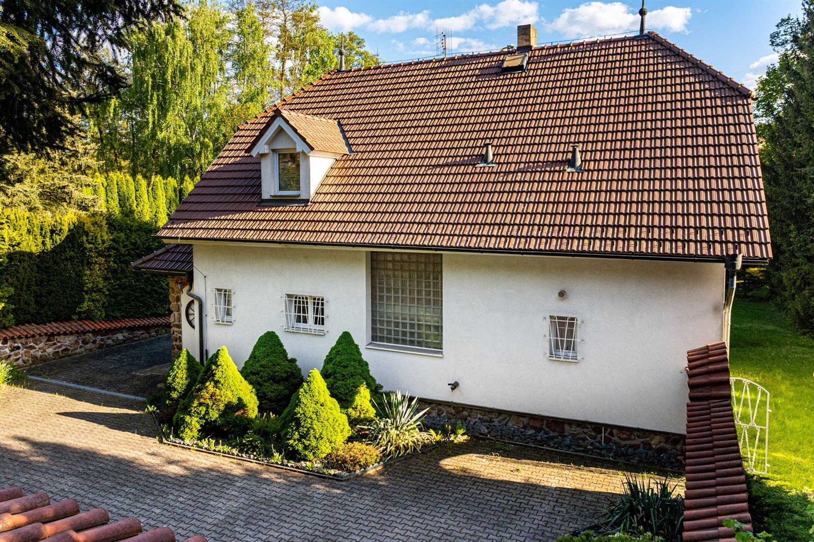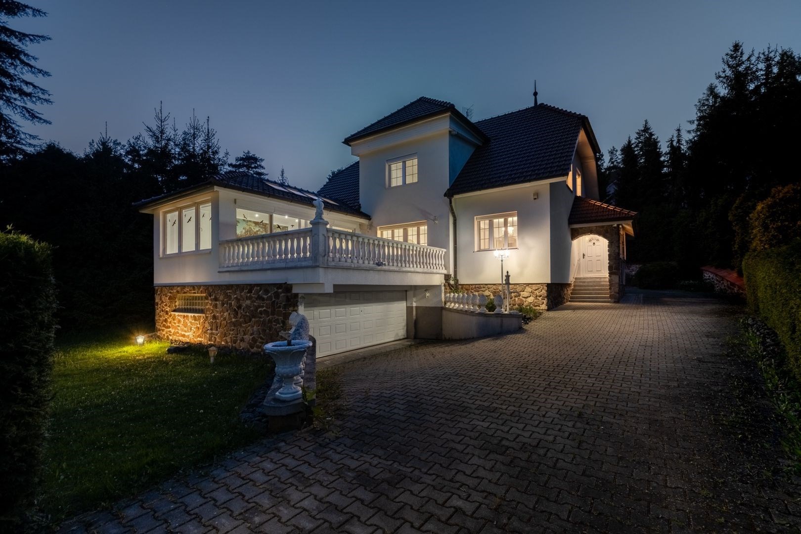 Pozemek 1 775 m² nabízí maximální soukromí. Zahradou protéká regulovaný potok, vzrostlé stromy a příjezdová cesta s ambientním osvětlením vytvářejí jedinečnou atmosféru. Garáž pro 2 vozy + parkování celkem až pro 8 automobilů.