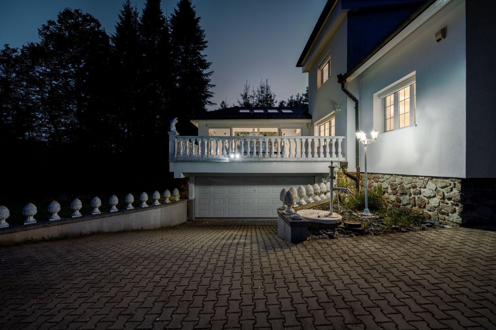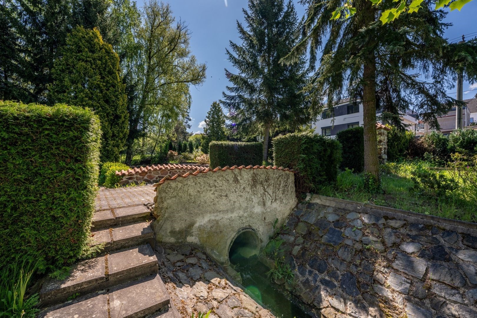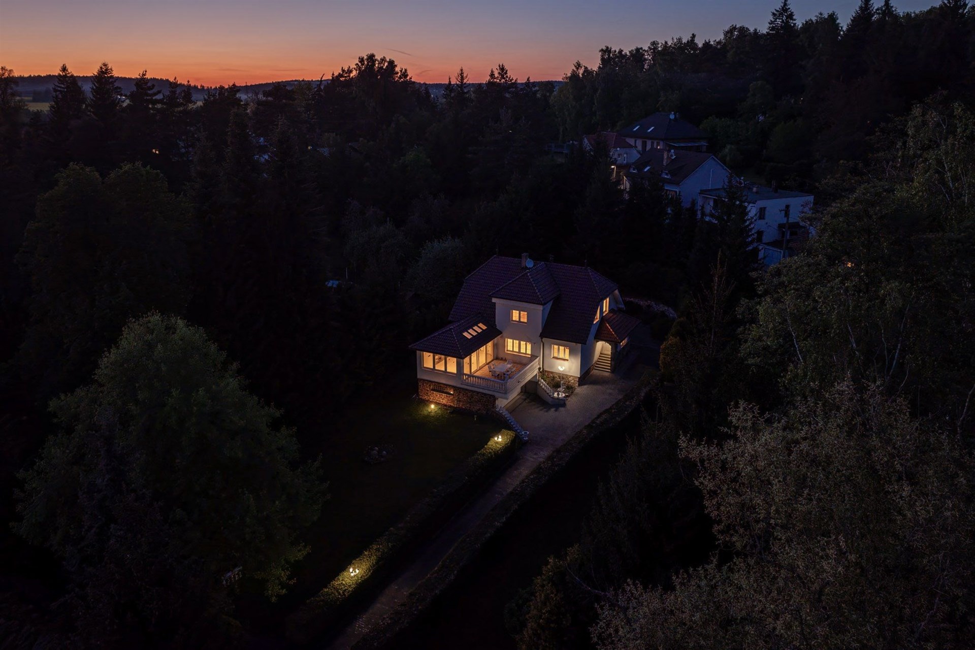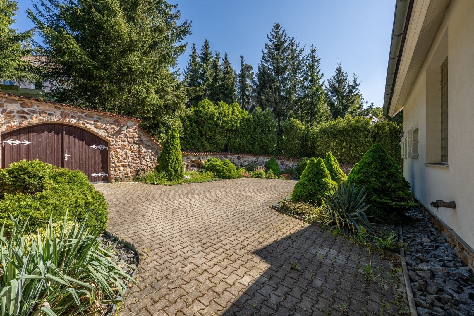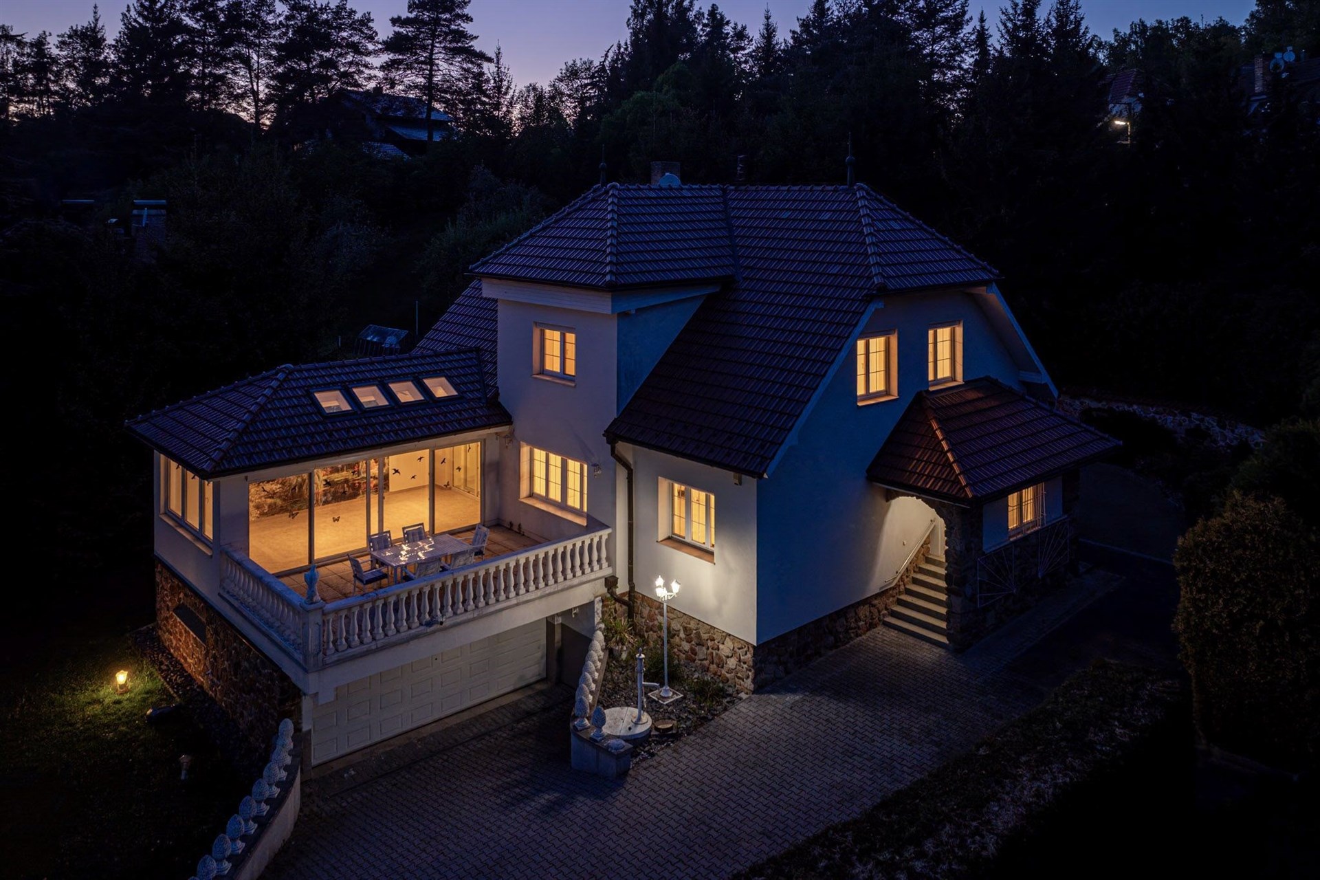 Pozemek 1 775 m² nabízí maximální soukromí. Zahradou protéká regulovaný potok, vzrostlé stromy a příjezdová cesta s ambientním osvětlením vytvářejí jedinečnou atmosféru. Garáž pro 2 vozy + parkování celkem až pro 8 automobilů.