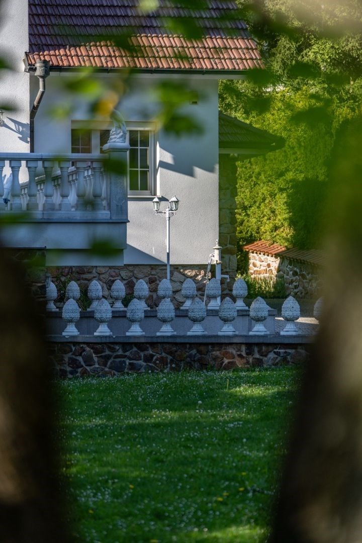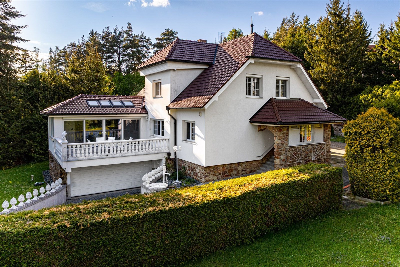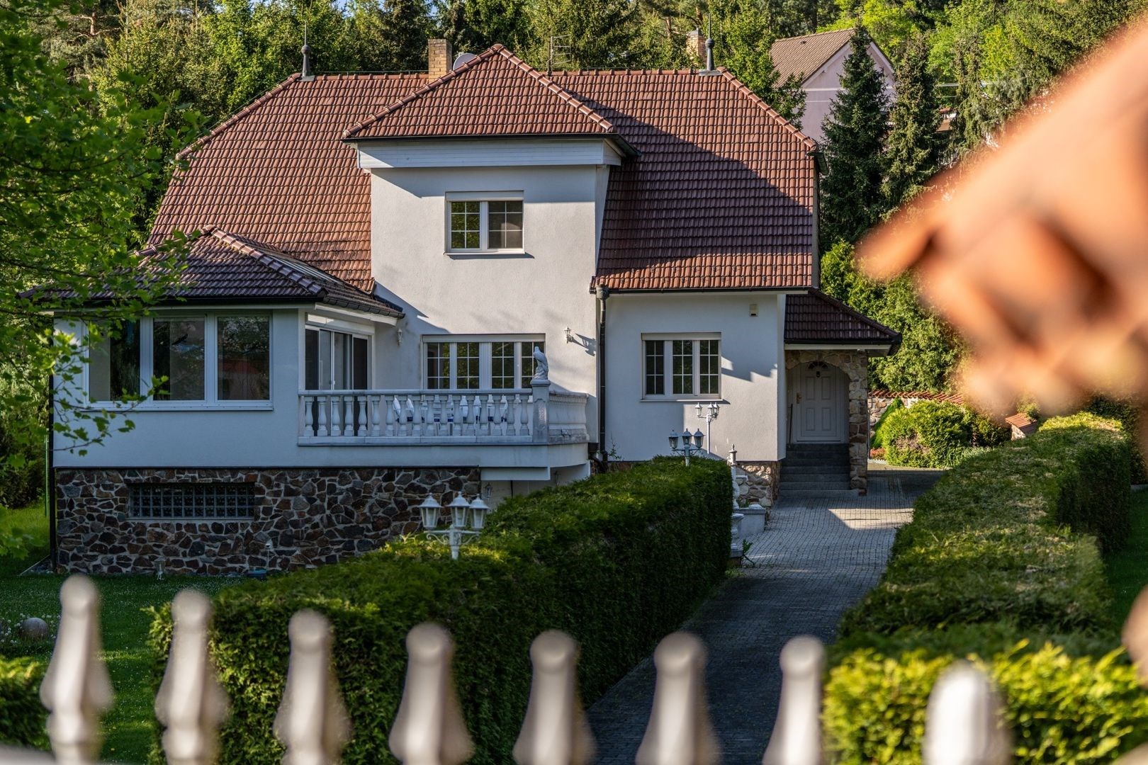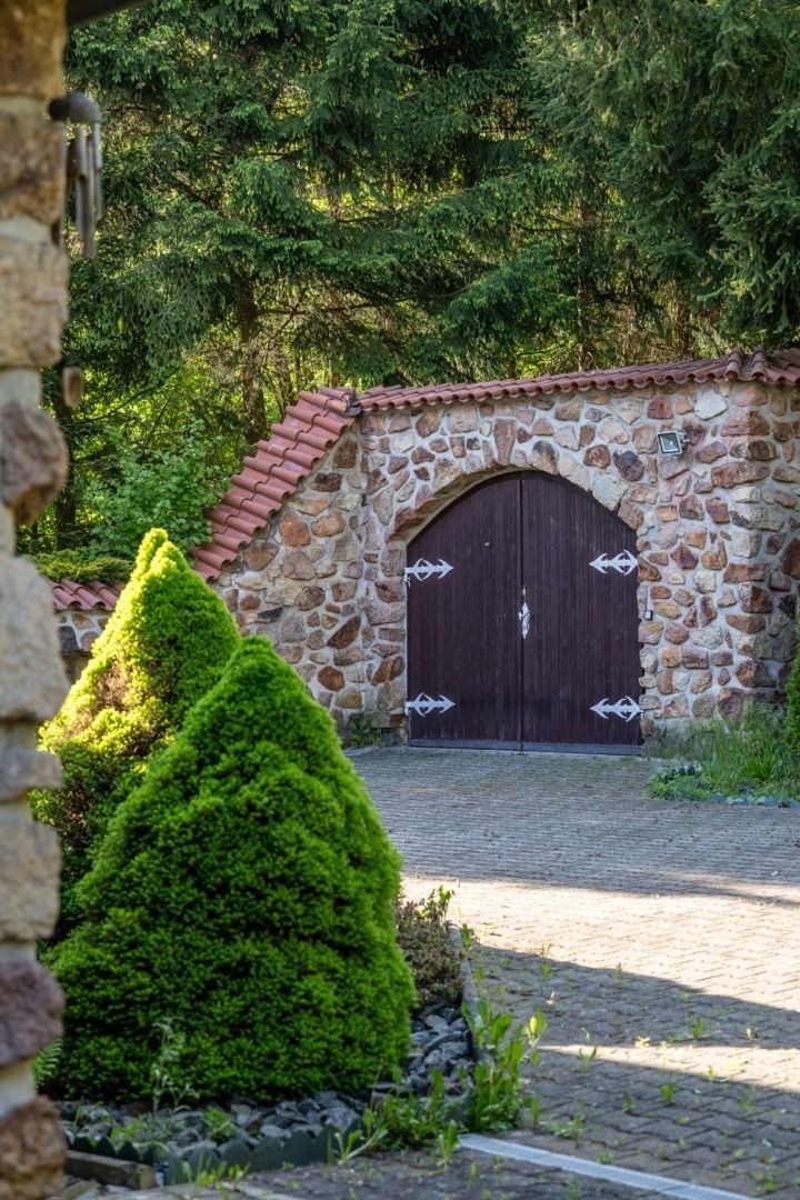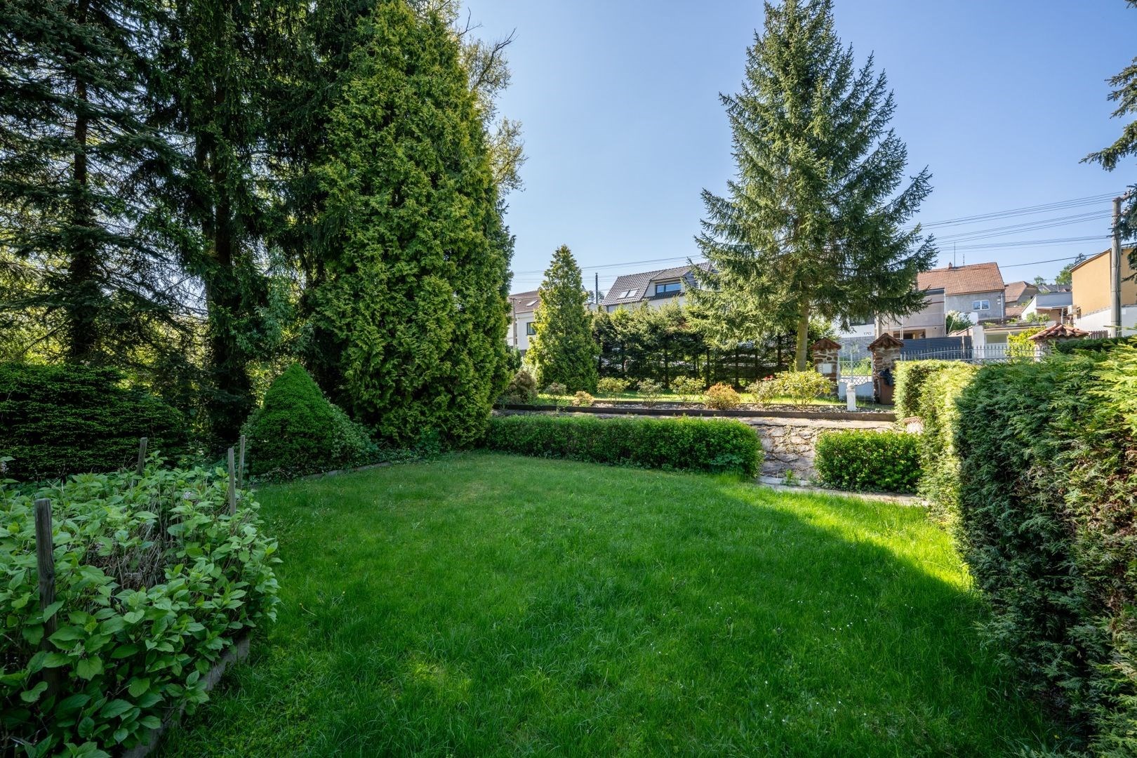 Pozemek 1 775 m² nabízí maximální soukromí. Zahradou protéká regulovaný potok, vzrostlé stromy a příjezdová cesta s ambientním osvětlením vytvářejí jedinečnou atmosféru. Garáž pro 2 vozy + parkování celkem až pro 8 automobilů.