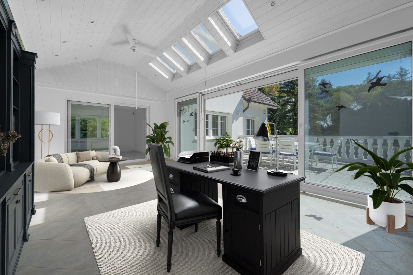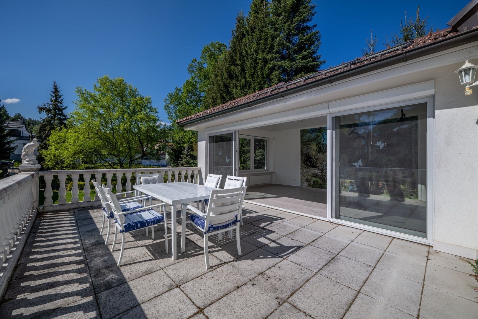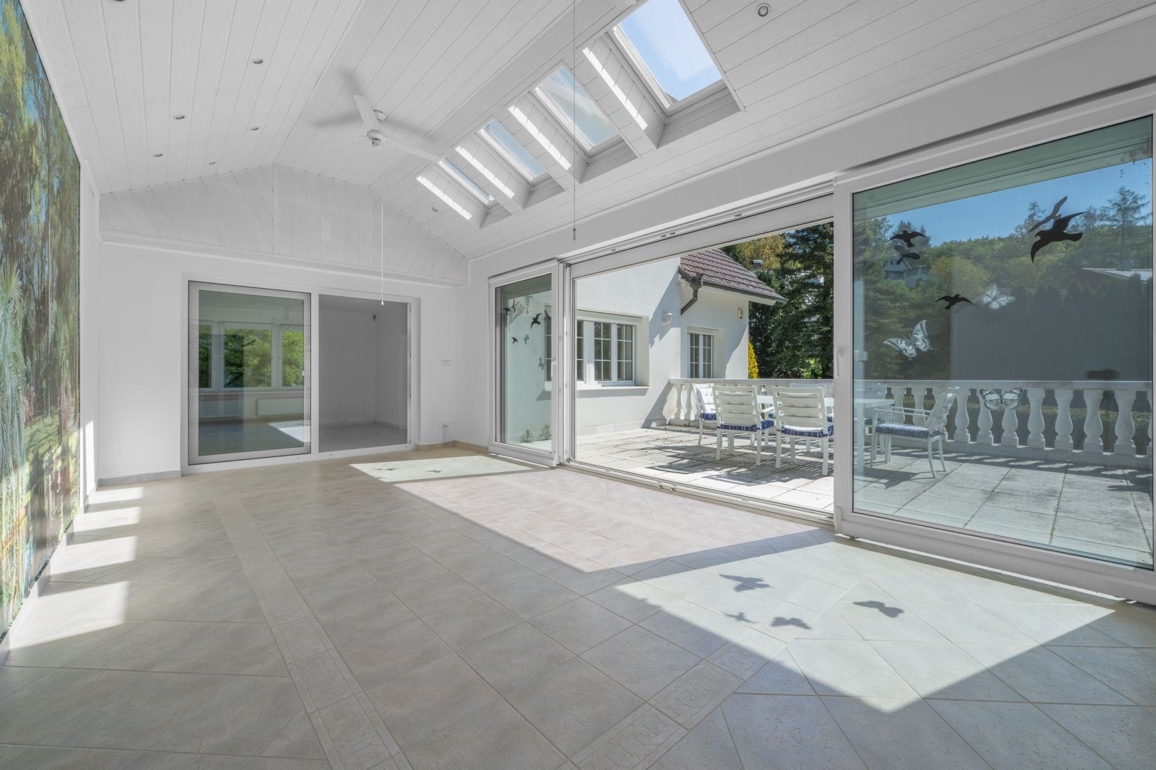 Kuchyň je vybavena vestavnými spotřebiči (trouba, sklokeramická deska, digestoř, myčka). Koupelny obsahují vanu, sprchový kout a dvě umyvadla. Zimní zahrada příjemně propojuje interiér se zahradou.