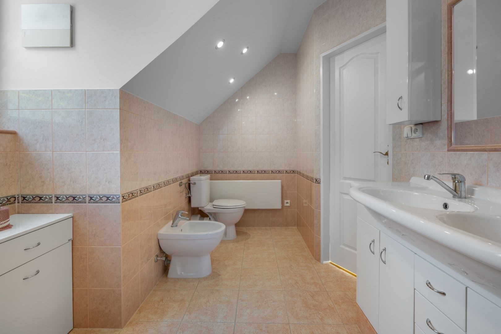 Podkroví: tři ložnice, dvě koupelny.