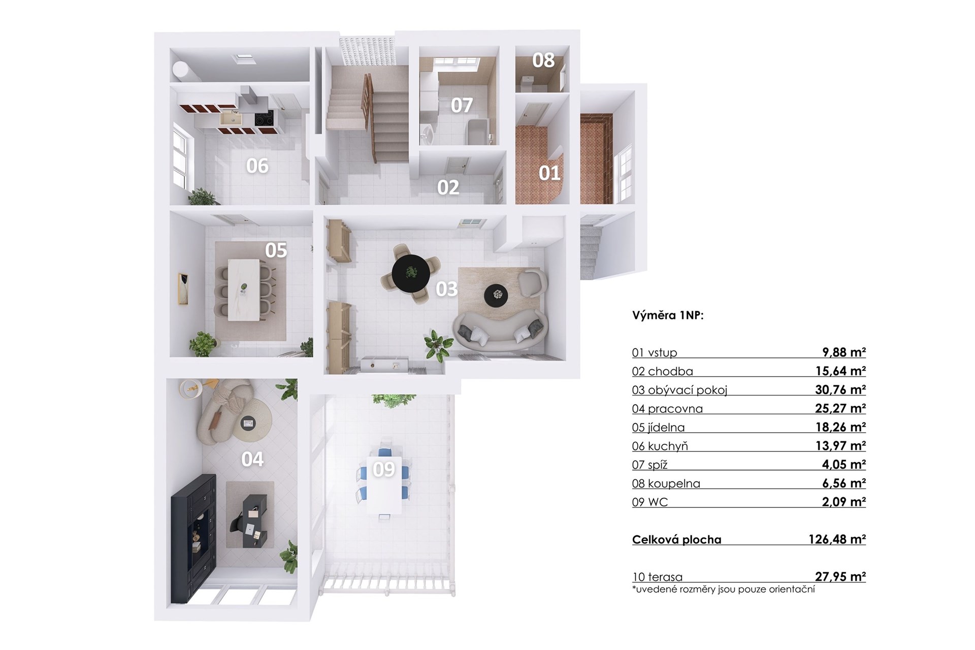 Přízemí: obývací pokoj, jídelna, kuchyň, spíž, zimní zahrada s přímým vstupem na terasu, koupelna a technická místnost.