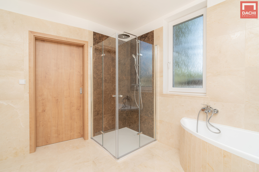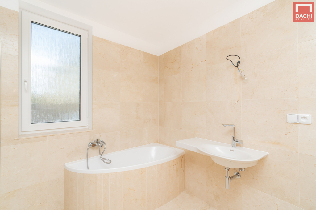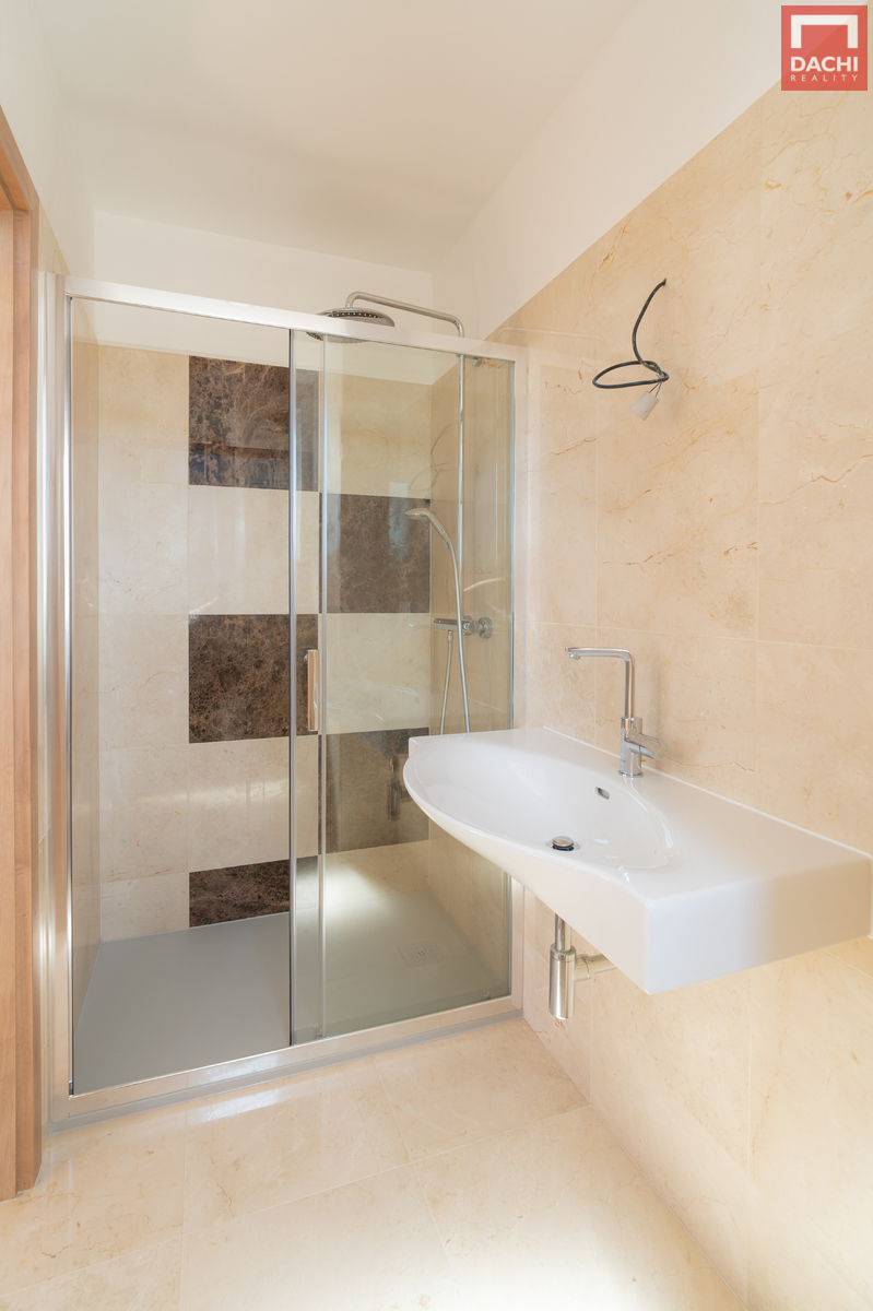 Druhá koupelna s WC a sprchovým koutem – mramorový obklad a sanita Laufen
