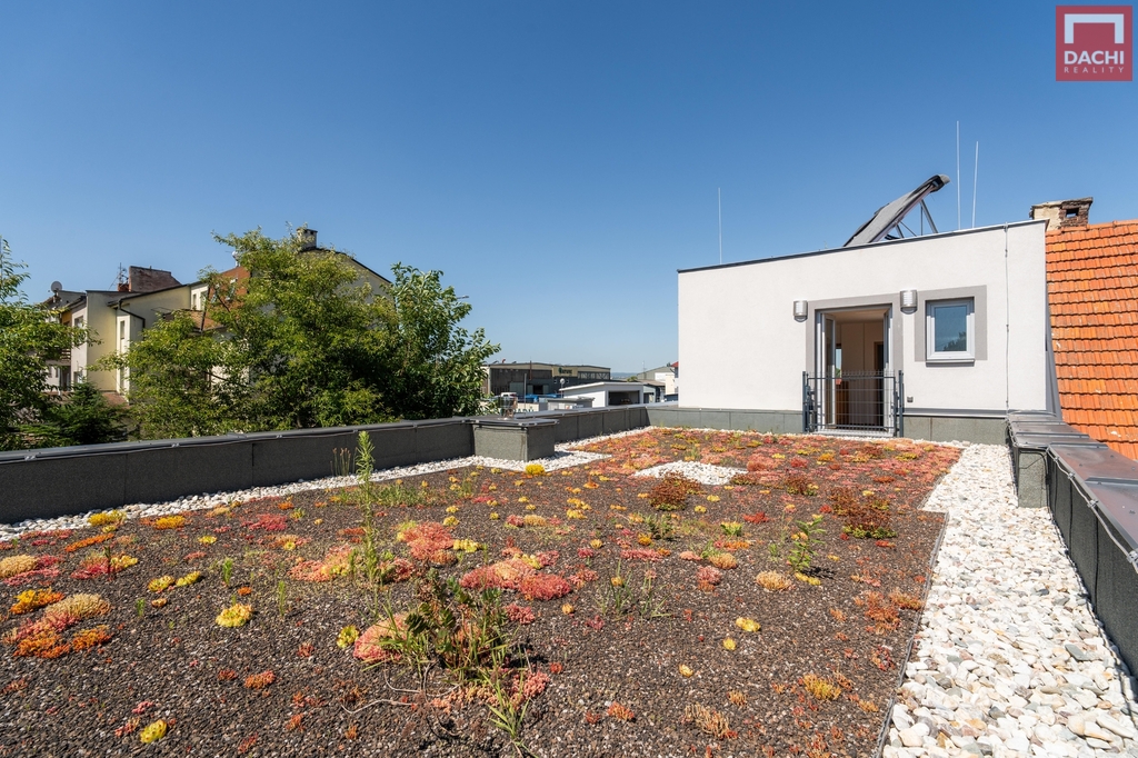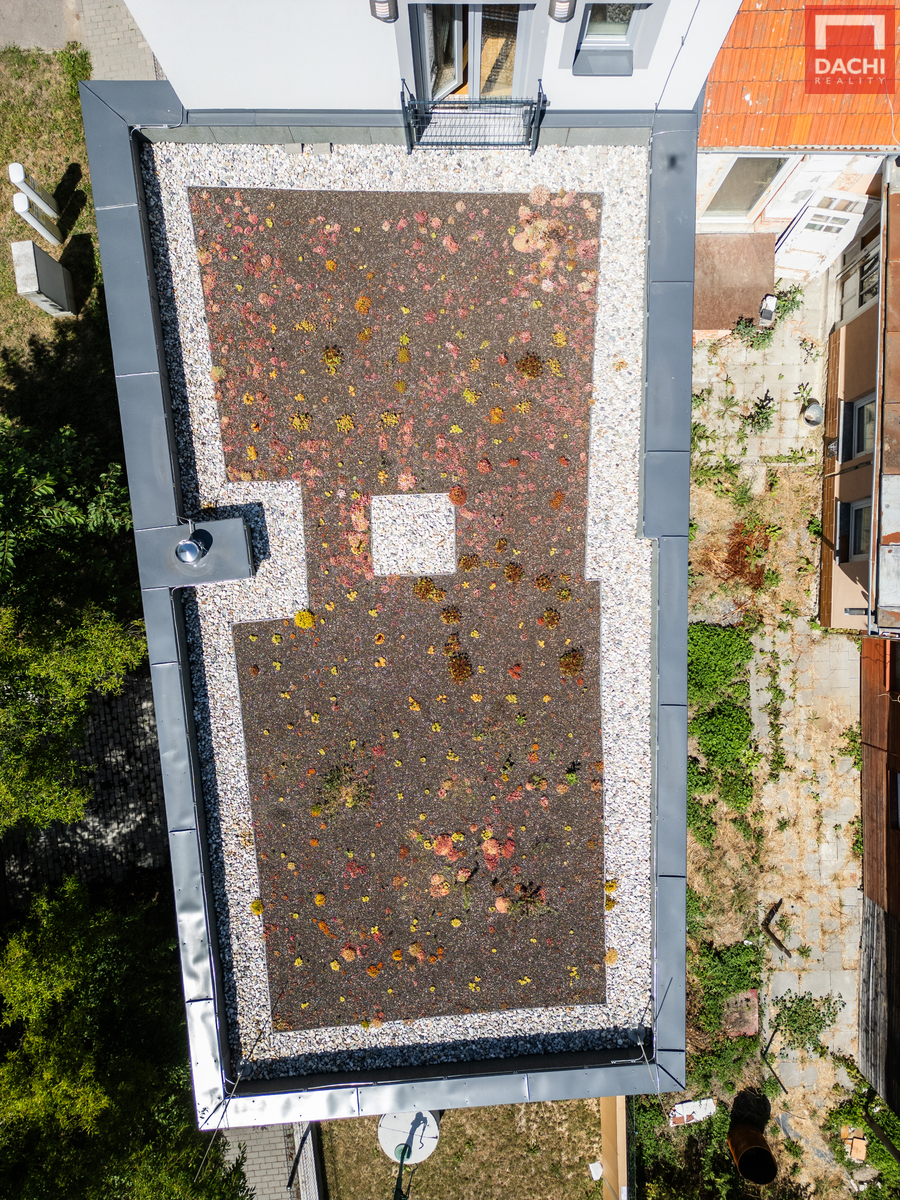 Přímý vstup na terasovou zahradu o ploše 70 m² se zelenou extenzivní střechou nad garáží