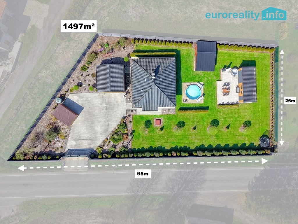 Celková výměra pozemku činí 1 497 m². Pozemek je oplocen kvalitním betonovým plotem, který zajišťuje soukromí. Vjezd na pozemek je řešen ocelovou bránou. Zahrada je ve výborném stavu, pravidelně udržovaná a nabízí příjemné prostředí pro relaxaci i rodinné aktivity. Nachází se zde vzrostlé stromy, okrasné keře, mulčované plochy a chodníky ze zámkové dlažby.