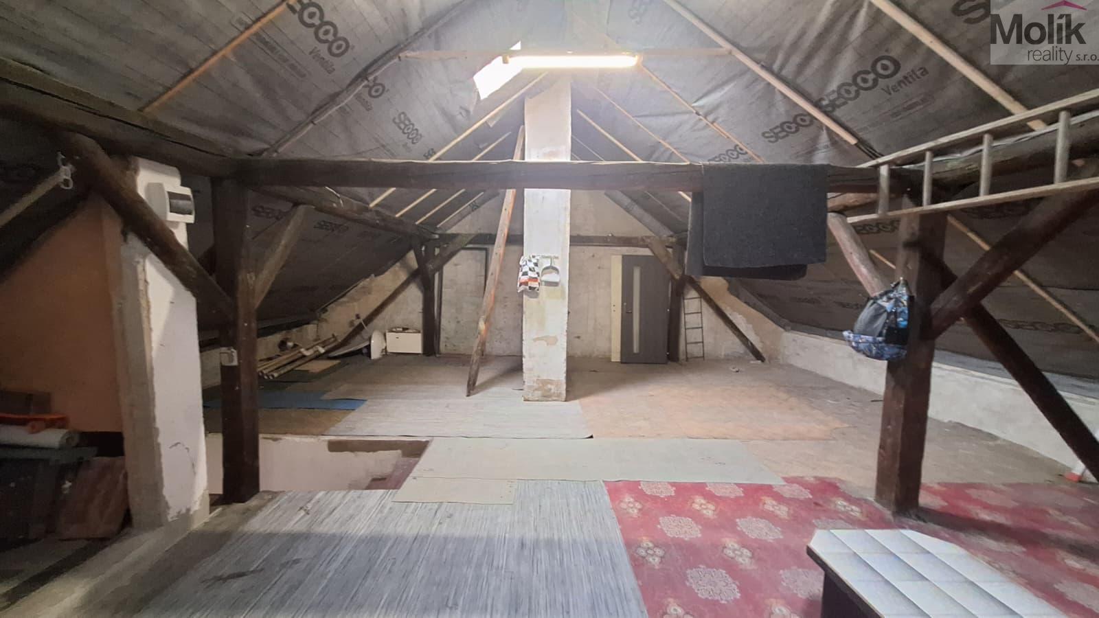 III.NP - veliký podkrovní pokoj, na zemi dřevěná podlaha, terasa, před úpravami.