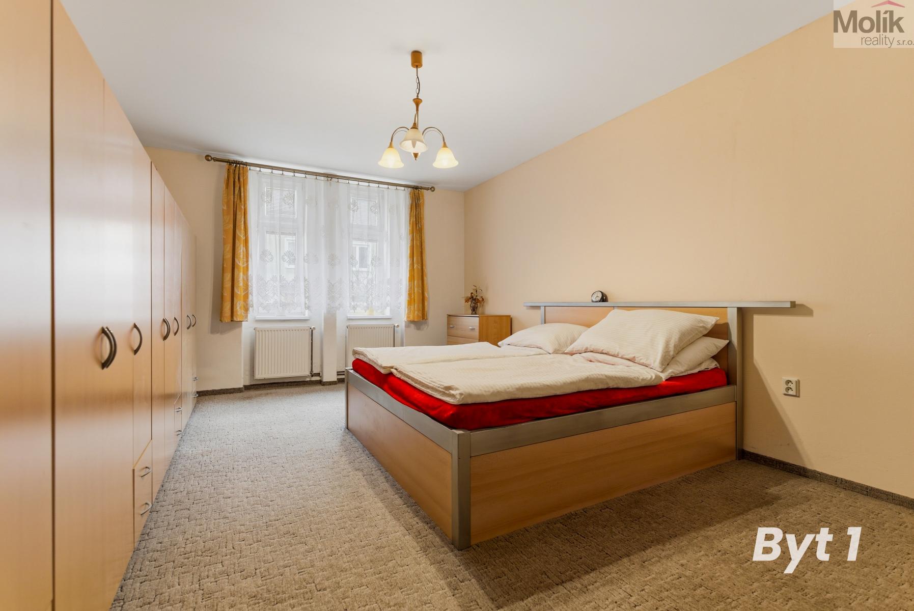V 1. nadzemním podlaží se nachází bytová jednotka o dispozici 3+1 a výměře 80 m2 (na fotografii označen byt 1), vybavená plastovými okny, s vlastním plynovým kotlem pro vytápění a samostatným elektroměrem.