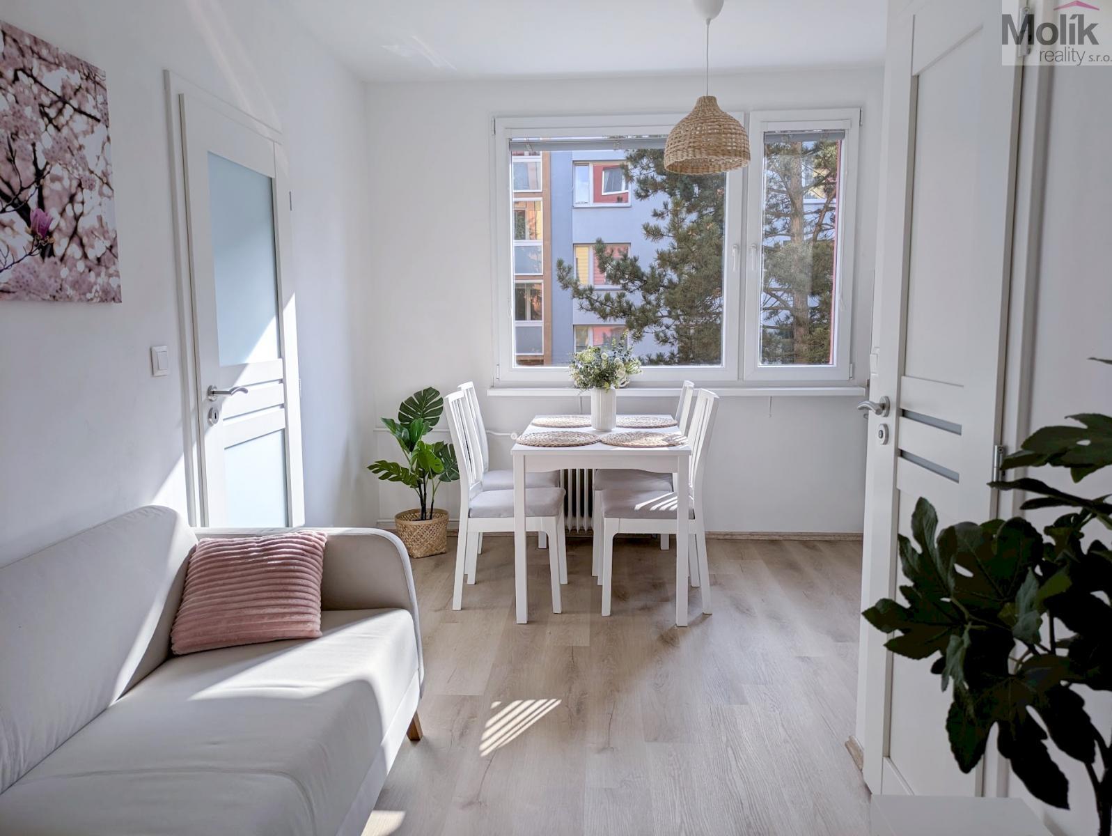 Byt se nachází ve zvýšeném přízemí (1. nadzemním podlaží) domu bez výtahu. Tento měsíc byla dokončena kompletní rekonstrukce, která zahrnovala výměnu rozvodů elektřiny a odpadů, renovaci zdí, stropů i podlahových krytin (vinyl), instalaci kuchyňské linky na míru (se zabudovanou myčkou, indukční varnou deskou ,horkovzdušnou troubou a výsuvnou digestoří), nové dveře včetně obložek a rekonstrukci koupelny a WC. Byt je velmi krásný a světlý, nabízí hezký výhled na okolní zeleň. Díky své poloze poskytuje příjemnou a klidnou atmosféru. V docházkové vzdálenosti 5-10 minut se nachází Zámecká zahrada, sportovní areál Bažantnice, rybník Leontýna i centrum města.