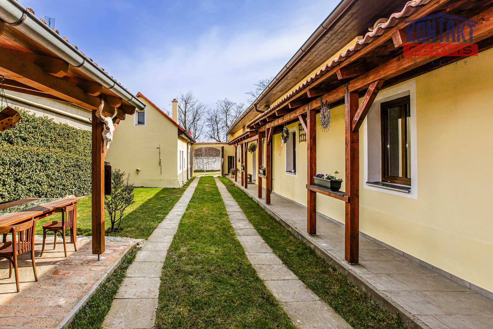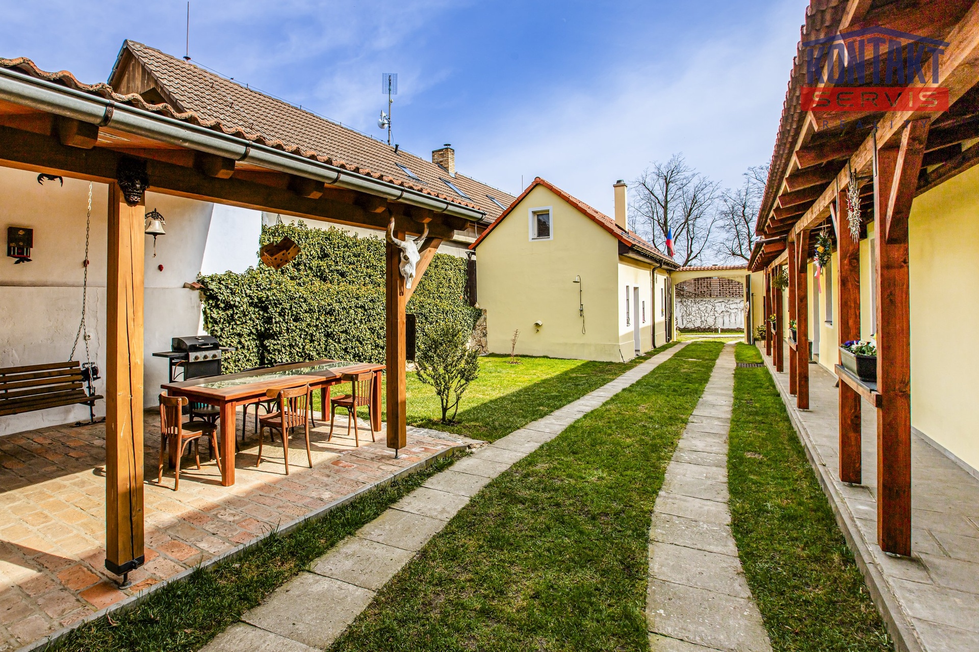 Nabízíme ke koupi kompletně rekonstruovanou vesnickou usedlost v obci Dunajovice, která se nachází necelých 6 km od lázeňského města Třeboň a 20 minut jízdy od jihočeské metropole. Hlavním obytným prostorem je samostatná jednotka o dispozici 5 + kk, přičemž v přízemí se nachází velký obývací pokoj spojený s kuchyní, samostatná ložnice a prostorná koupelna. V podkroví jsou pak tři pokoje a druhá koupelna se sprchovým koutem a toaletou. V hlavní budově na obytnou část navazují další prostory, které lze buď využít jako technické zázemí domu nebo je zde možno vybudovat další bytové jednotky (veškeré přípravy rozvodů jsou provedeny). V uzavřeném dvoře se nachází krásná pergola a samostatně stojící vejměnek s navazující kotelnou. Půdorys stavení uzavírá prostorná a průjezdná stodola. Za domem je k využití rozlehlá udržovaná zahrada s vedlejšími stavbami (krytá parkovací stání pro tři auta, kolna, přístřešek na dřevo apod.). Dům je napojen na obecní vodovod a kanalizaci, k dispozici je i vlastní studna. Zavedena je také elektřina 230/400 V. Vytápění je zajištěno vlastním kotlem na dřevoplyn s rozvodem do podlah nebo radiátorů. Celková výměra pozemků činí 1 633 m². Tato výjimečná nabídka je vhodná pro ty, kteří touží po velkém historickém stavení v novém kabátě. Podrobnosti k zakázce a osobní prohlídku Vám rádi zprostředkujeme.