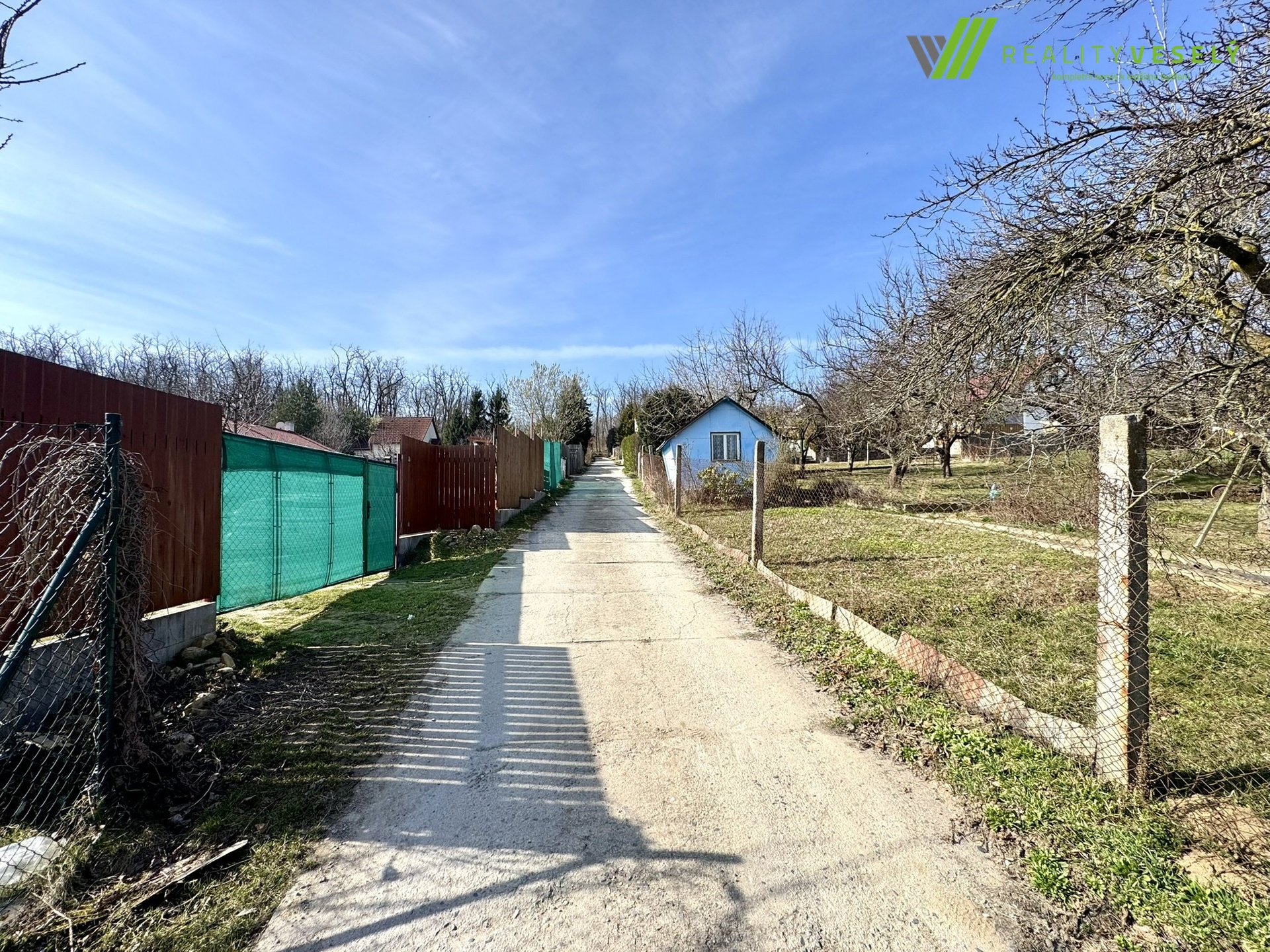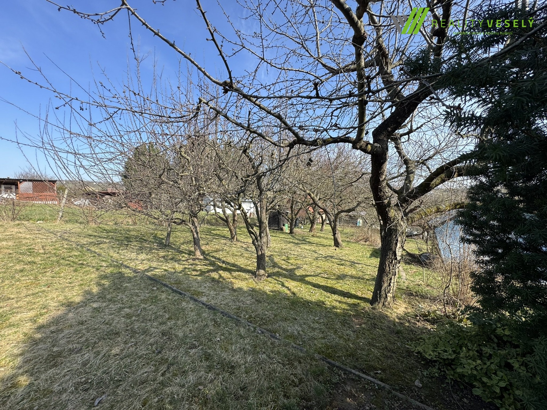 Velkou výhodou je dostupnost inženýrských sítí – elektřina se nachází na hranici pozemku a přímo na zahradě je k dispozici také sezonní voda pro zalévání.