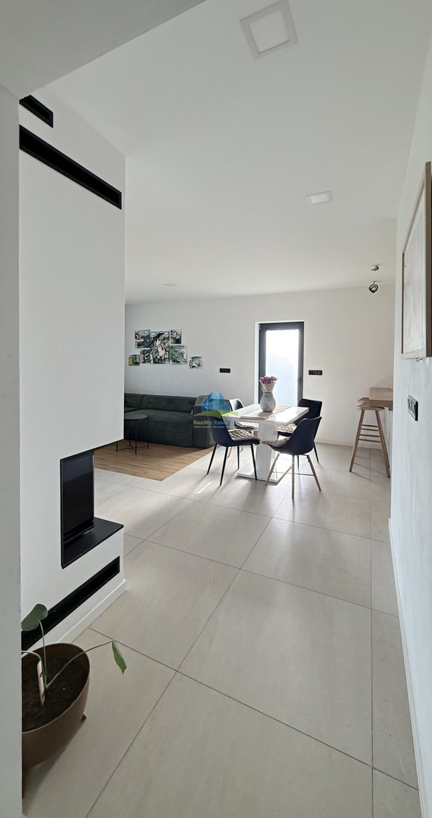 Při vstupu projdeme chodbou, která nás zavede do srdce tohoto nízkoenergetického domu – obývacího pokoje s kuchyní. Tento prostor je dokonale prosvětlený a nabízí dostatek místa pro rodinné chvíle. Dále zde najdeme krbová kamna, která dodávají prostoru útulnost a zpříjemňují zimní večery.
