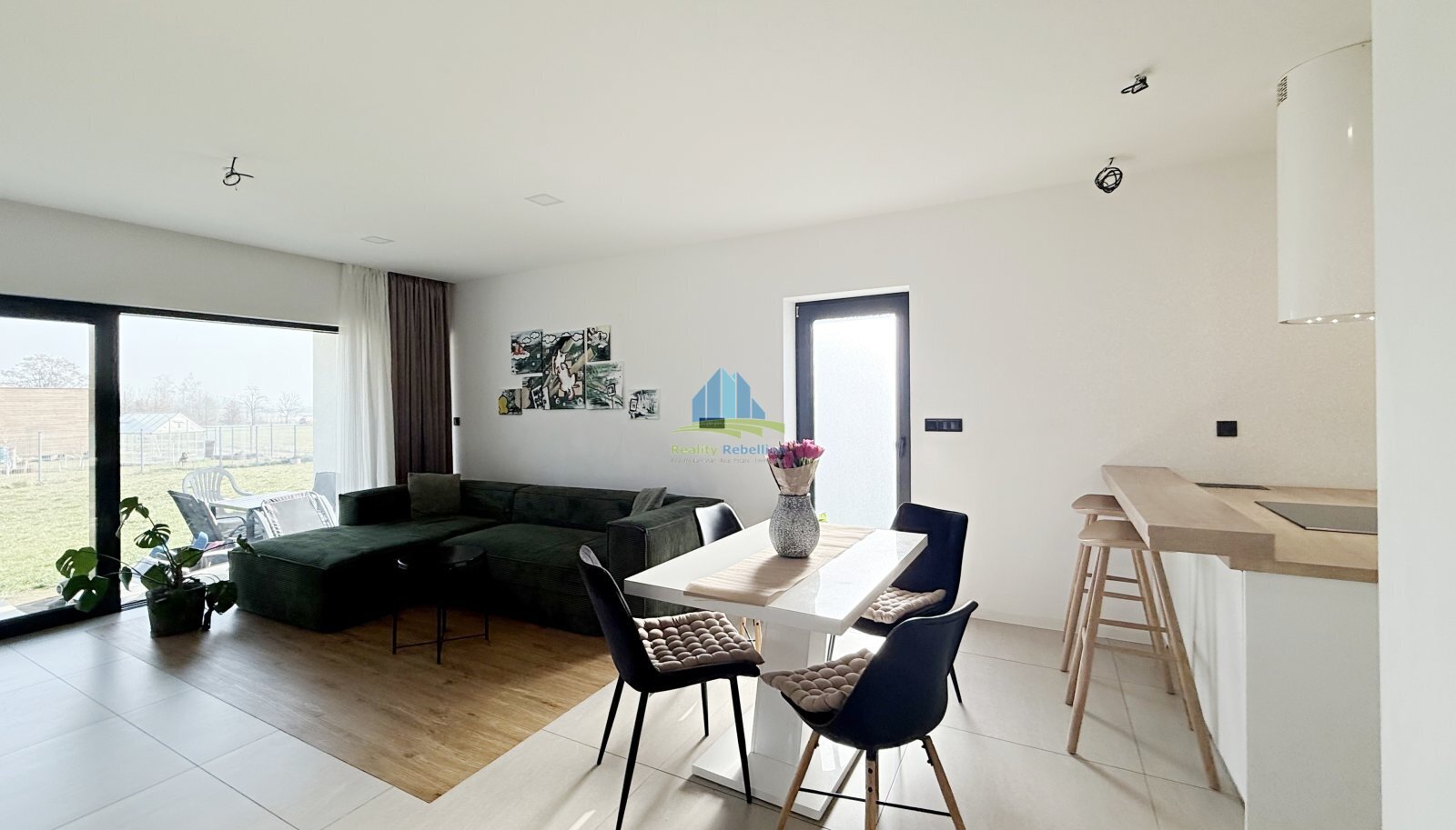 Dispozice 4+1 klade důraz na otevřený prostor, přirozené světlo a plynulé propojení interiéru se zahradou. Dominantou celého domu je velkorysý obývací pokoj s velkorysou kuchyní.