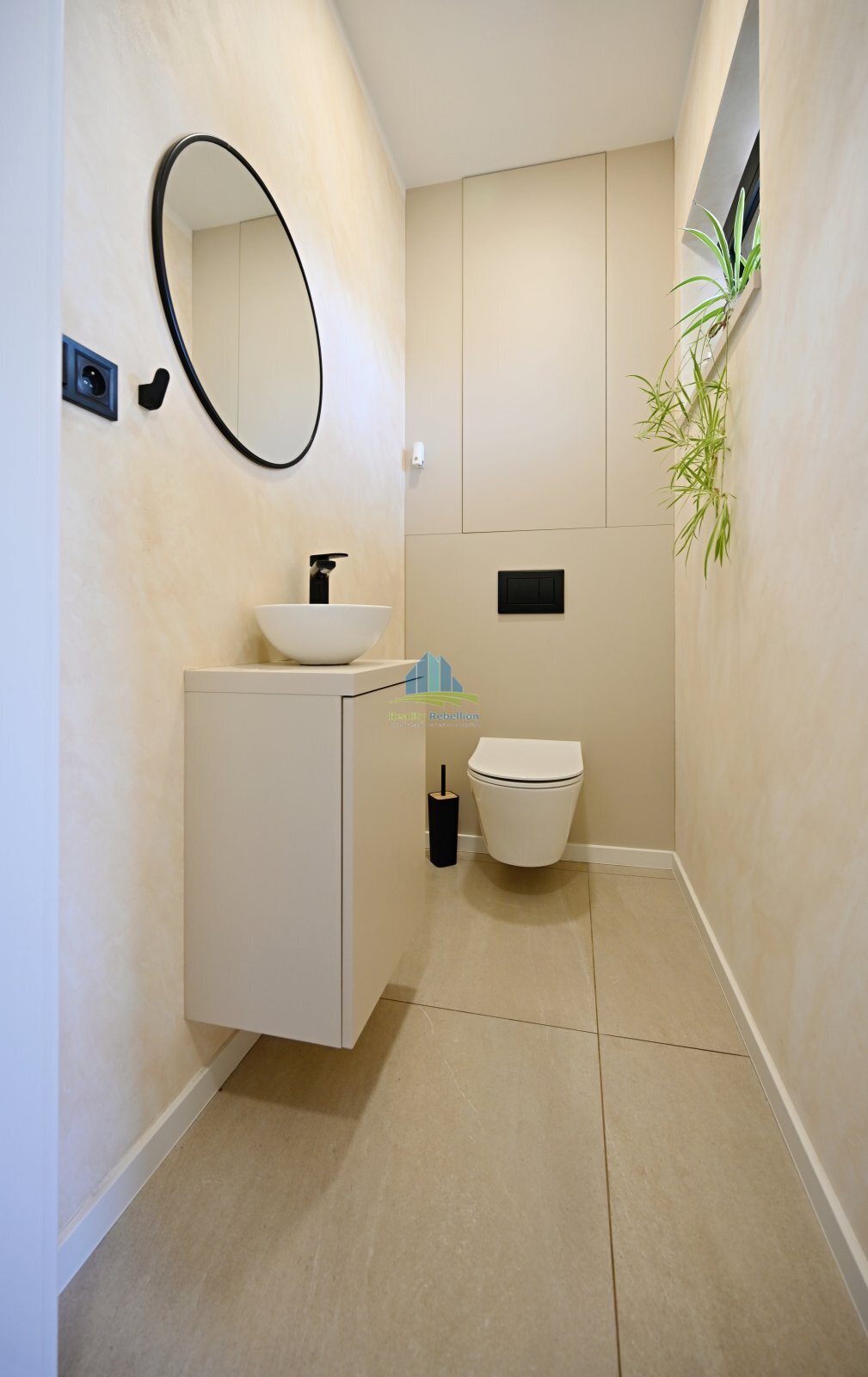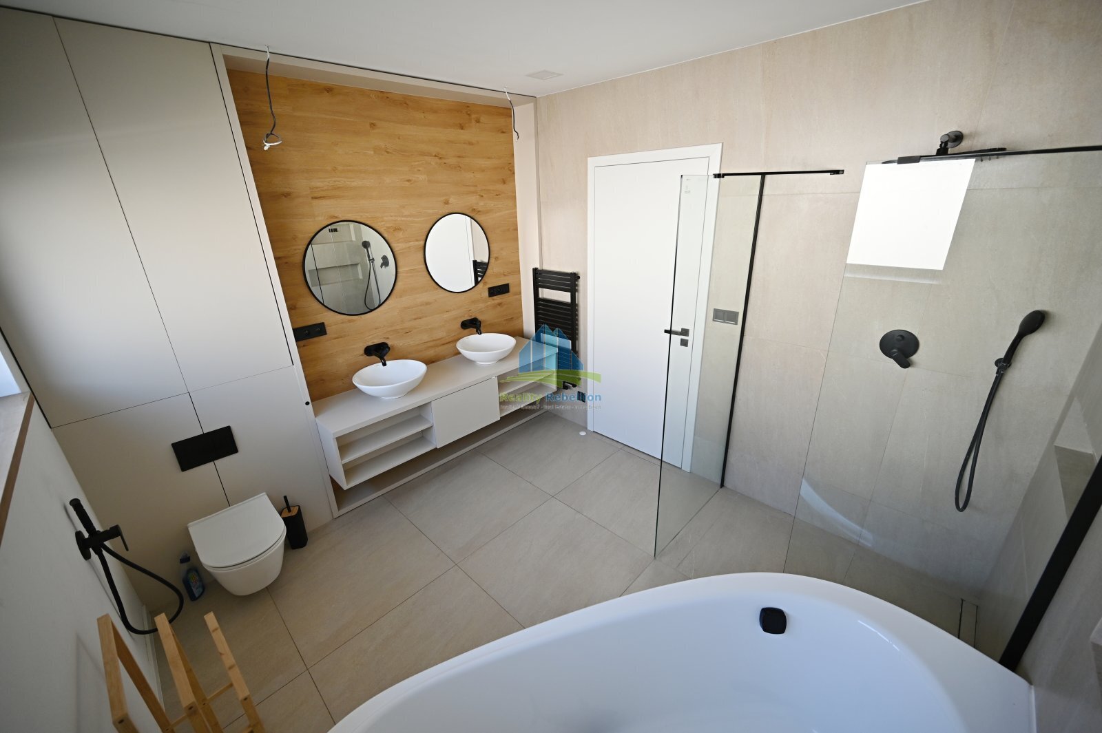 Dům nabízí tři samostatné ložnice. Dále koupelnu s WC, vanou, sprchovým koutem a dvěma umyvadly. Přímo u vchodu se nachází samostatné WC s umyvadlem.. Součástí je i spíž a technická místnost. Hlavní ložnice disponuje prostornou šatnou, kterou ocení hlavně ženy.