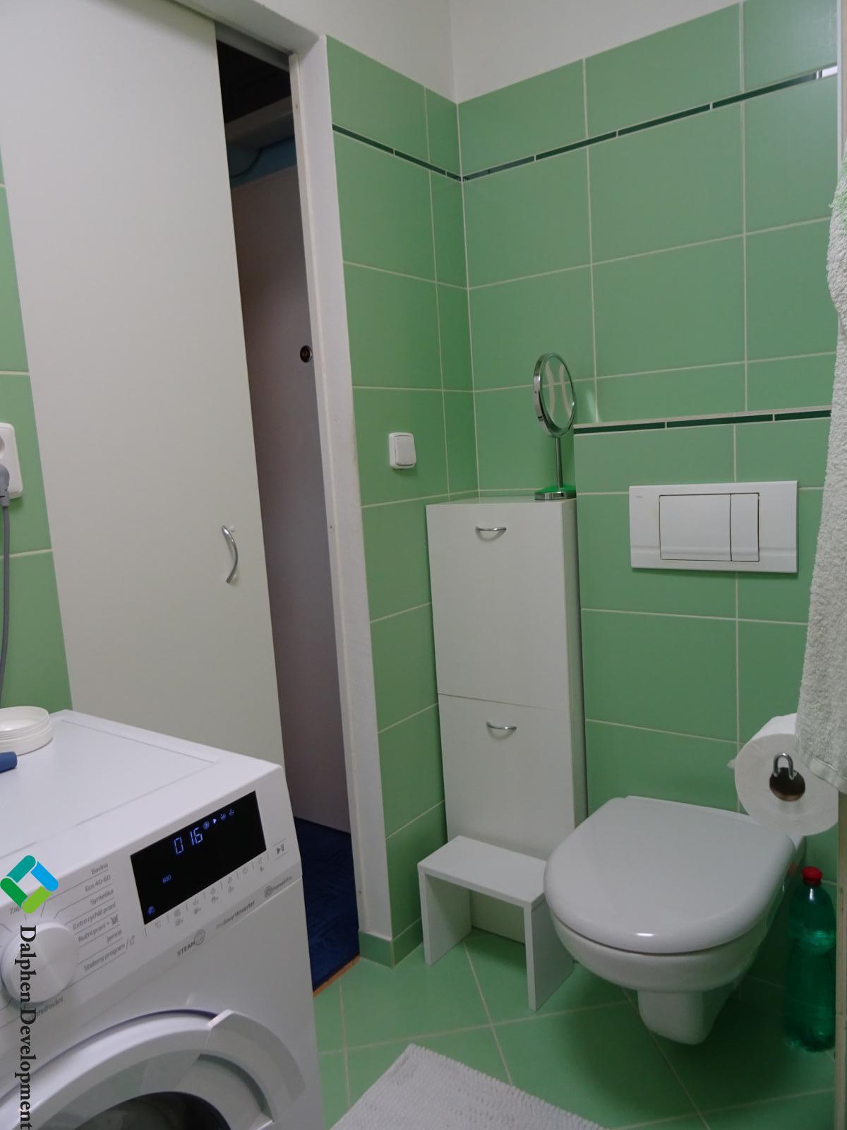 Koupelna s WC: Kompletně zrekonstruovaná, s vanou, závěsné WC, prostor pro pračku, umyvadlo se skříňkou a posuvné dveře.