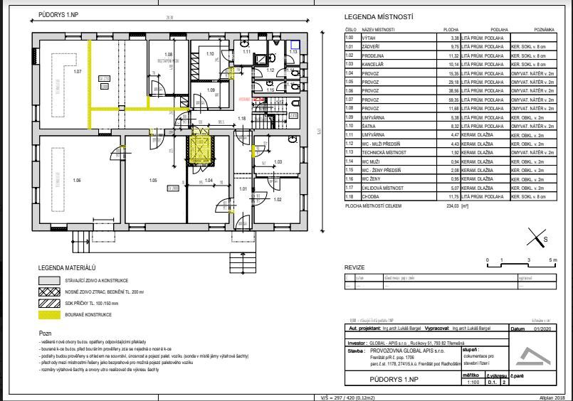 - 1. NP – o zastavěné ploše 296,99 m2 a podlahové ploše 233,27 m2 má tyto prostory: Zádveří 9,75 m2, výtah 3,38 m2, prodejna 11,32 m2, kancelář 10,14 m2, výrobní prostor 15,35 m2, výrobní prostor 29,60 m2, výrobní prostor 38,56 m2, výrobní prostor 59,35 m2, výrobní prostor 11,68 m2, výrobní prostor 5,38 m2, šatna 8,32 m2, umývárna 4,47 m2, WC muži předsíň 4,43 m2, technická místnost 1.92 m2, WC muži 0,94 m2, WC ženy předsíň 2,08 m2, WC ženy 0,95 m2, úklidová místnost 5,07 m2 a chodba 10,57 m2.