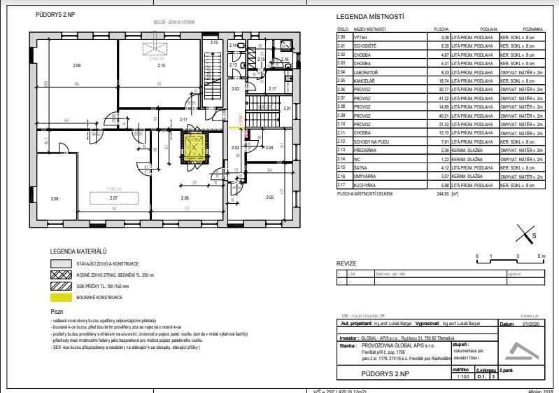 - 2. NP – o zastavěné ploše 296,99 m2 a podlahové ploše 244,52 m2 má tyto prostory: schodiště 8,30 m2, výtah 3,38 m2, chodba 4,87 m2, chodba 5,14 m2, laboratoř 8,53 m2, kancelář 18,74 m2, výrobní prostor 30,77 m2, výrobní prostor 41,32 m2, výrobní prostor 14,89 m2, výrobní prostor 40,51 m2, výrobní prostor 31,33 m2, chodba 12,10 m2, schodiště 7,91 m2, předsíňka 2,36 m2, WC 1,22m2, šatna 4,12 m2, umývárna 3,07 m2 a kuchyňka 5,98 m2.