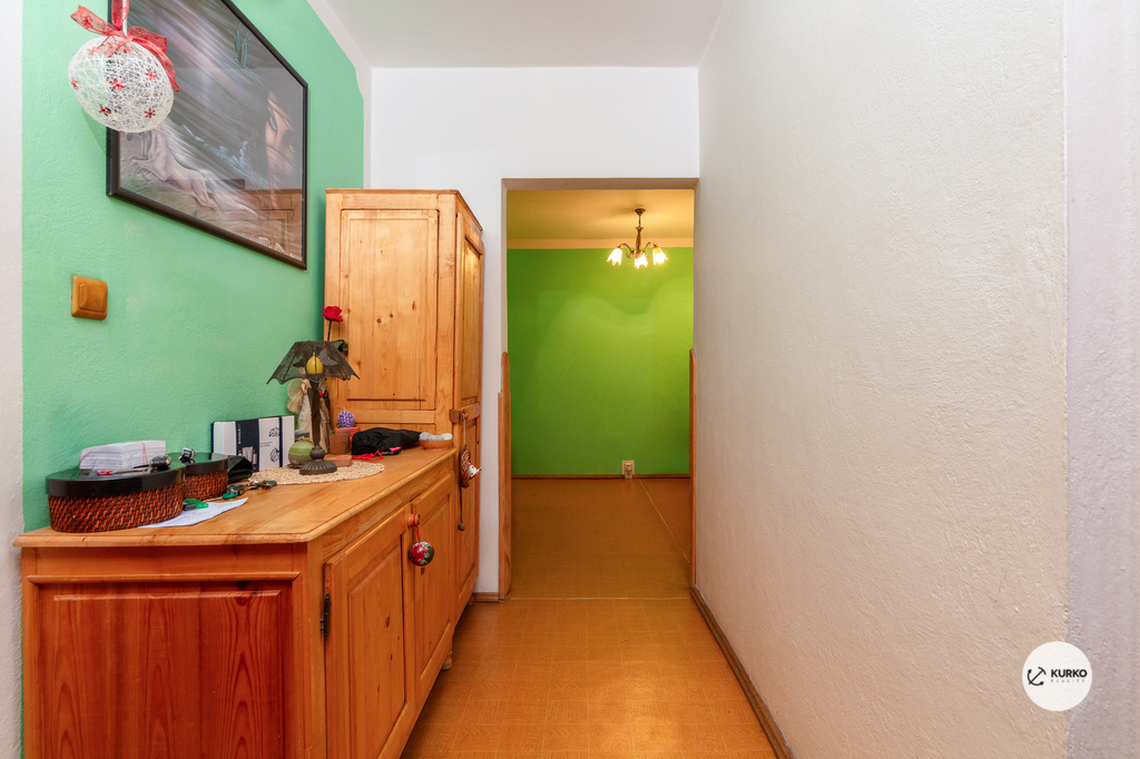 Dispozice je řešena velmi prakticky – vstupní chodba, koupelna s vanou a toaletou, samostatná kuchyně, obývací pokoj se vstupem na balkon a tři samostatné obytné pokoje. Mezi dvěma zadními pokoji se nachází další prostor vhodný pro pracovnu nebo šatnu.
