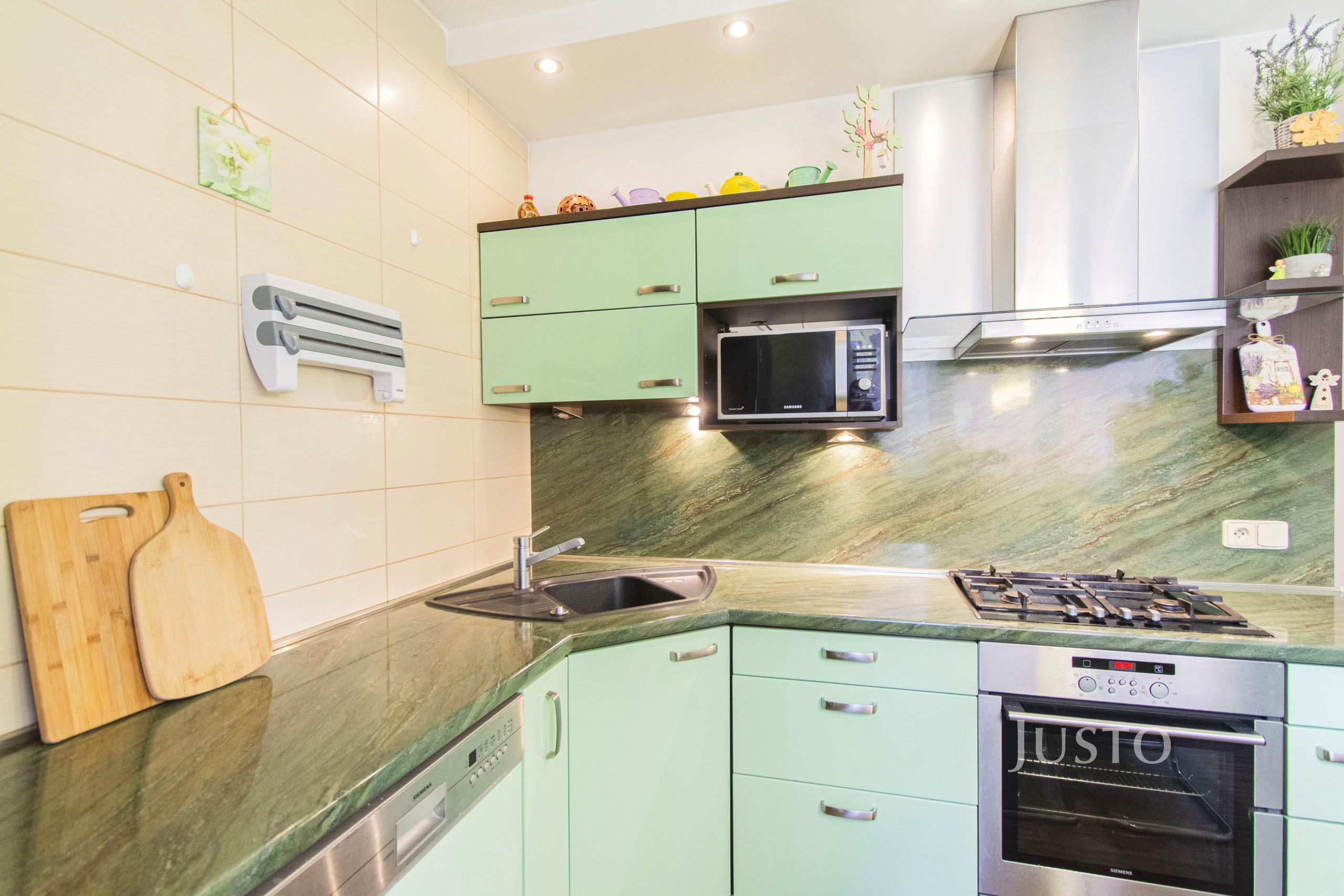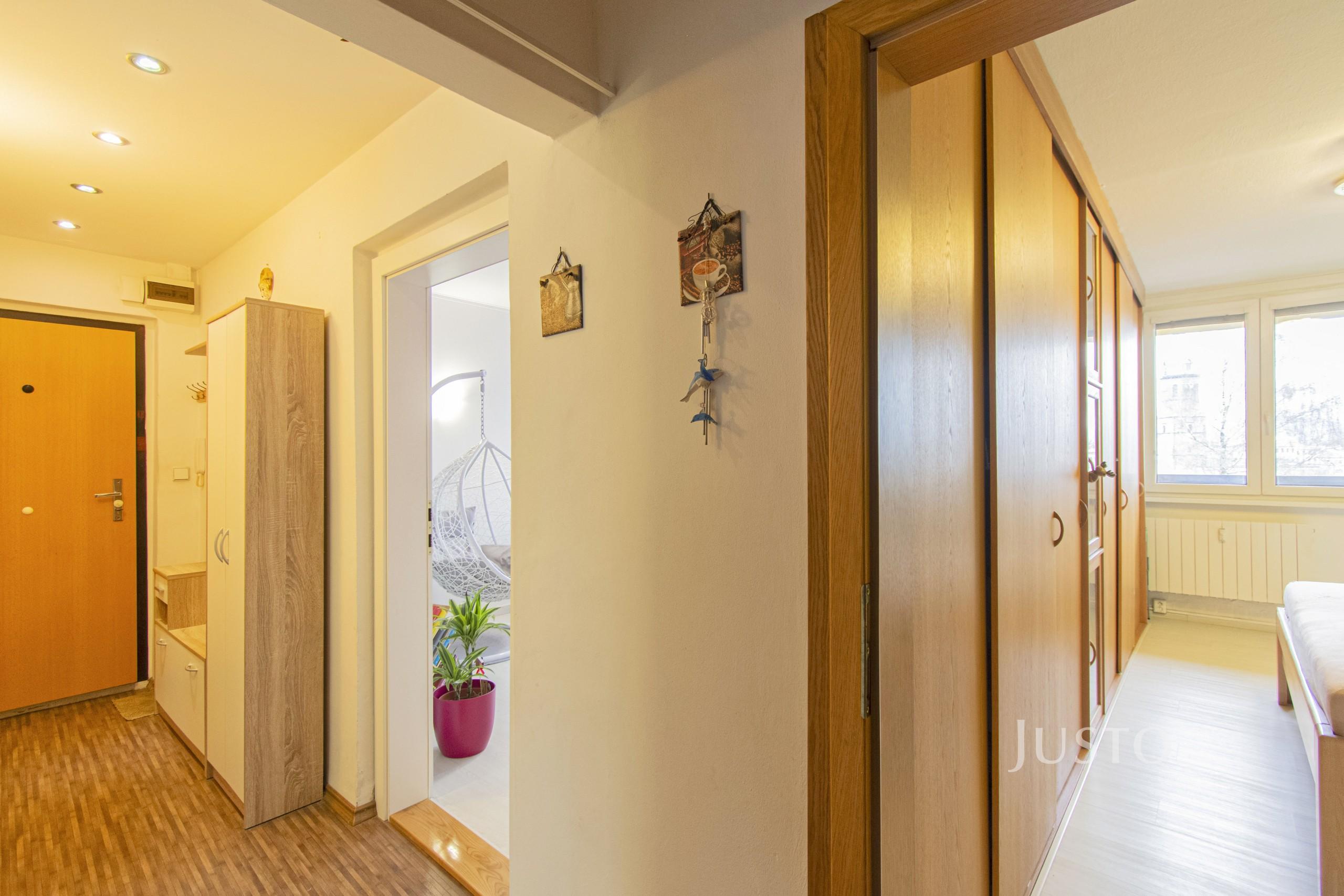 Byt samotný má již vyzděné jádro, koupelna je od toalety oddělena. Obývací pokoj má výměru 18 m², pokoje 18 m² a 15 m². Byt disponuje skvělou uzavíratelnou komorou, ve které jsou policové až po strop a díky nim je v této místnosti spousta úložného prostoru. Kuchyně (12 m²) je vybavena linkou na míru, vestavnou myčkou, digestoří, plynovým sporákem a troubou. O ostatních spotřebičích je možno jednat, zda v bytě zůstanou či nikoliv. V jednom z pokojů ale určitě zůstane vestavná skříň, která je po celé délce pokoje.