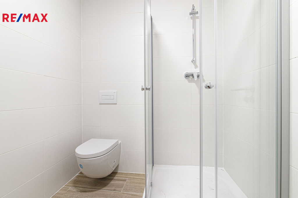Byt disponuje moderní koupelnou se sprchovým koutem a toaletou, která je součástí jednoho celku – praktické a elegantní řešení v moderním stylu.