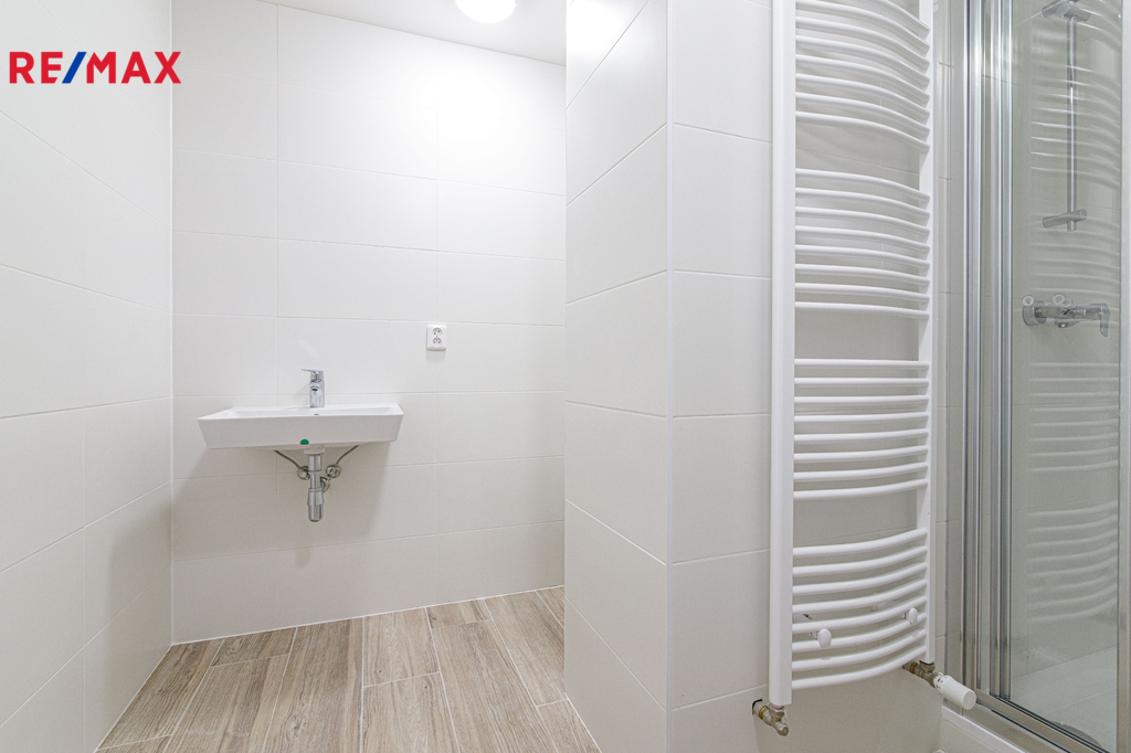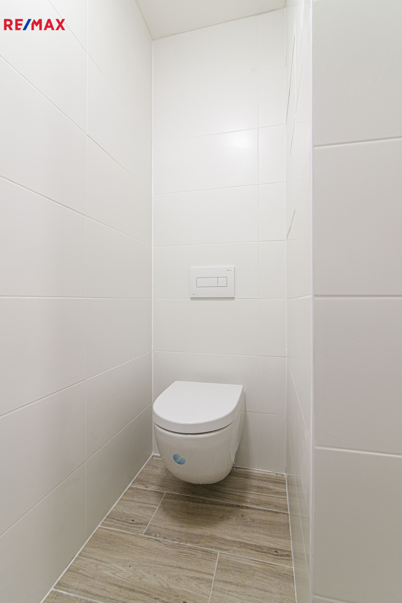 Byt disponuje moderní koupelnou se sprchovým koutem a toaletou, která je součástí jednoho celku – praktické a elegantní řešení v moderním stylu.
