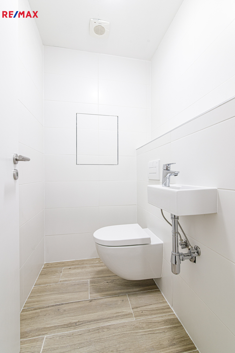 Byt disponuje moderní koupelnou s vanou, přičemž toaleta je řešena samostatně, což zvyšuje komfort každodenního užívání.