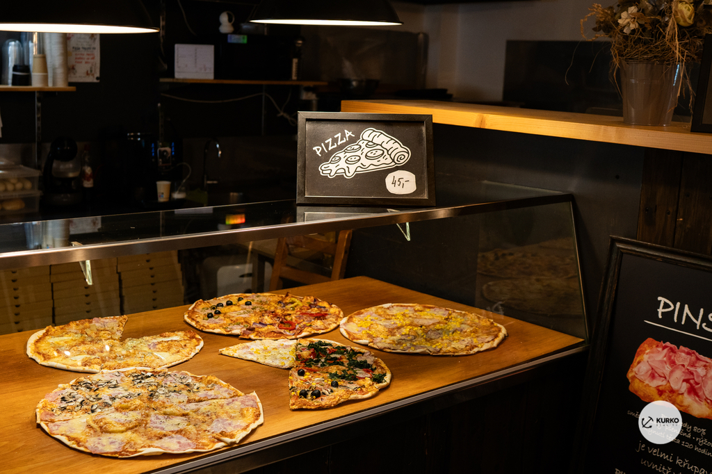 pizza pec, hnětač, vyvalovačka, kávovar, kasa s pokladním systémem, nářezák, lednice, saladeta, mrazáky, pracovní pulty a vitrína.