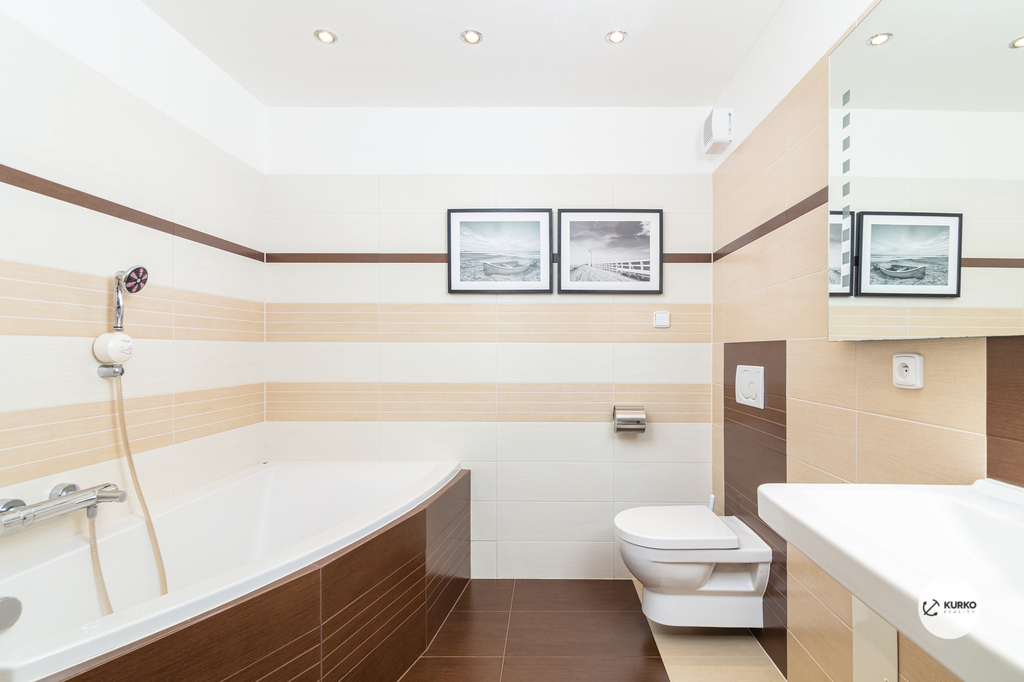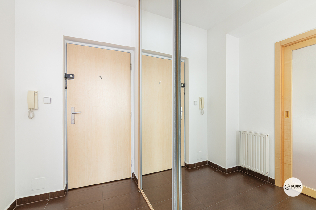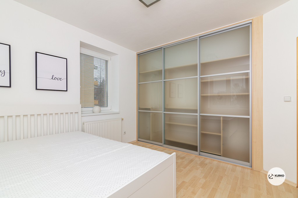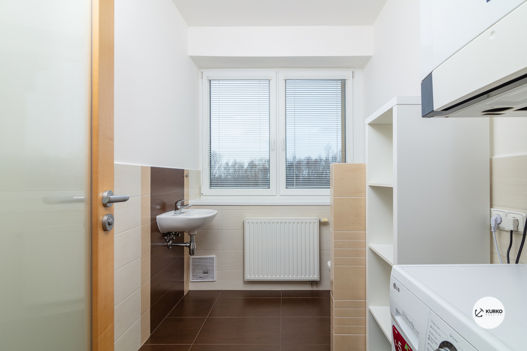 Celková výměra bytu činí téměř 90 m² a jeho dispozice je velmi prakticky řešena. Dominantou je prostorný obývací pokoj s kuchyňským koutem, který je vybaven vestavěnými spotřebiči včetně vinotéky a navazuje na jídelní část. Byt dále disponuje dvěma samostatnými obytnými pokoji, přičemž v jednom z nich jsou vestavěné skříně. Koupelna je vybavena vanou, sprchovým koutem a toaletou. Velkým benefitem je samostatná technická místnost s prostorem pro pračku a druhé WC. Úložné prostory jsou promyšleně řešeny také v chodbě, kde se nacházejí vestavěné skříně.