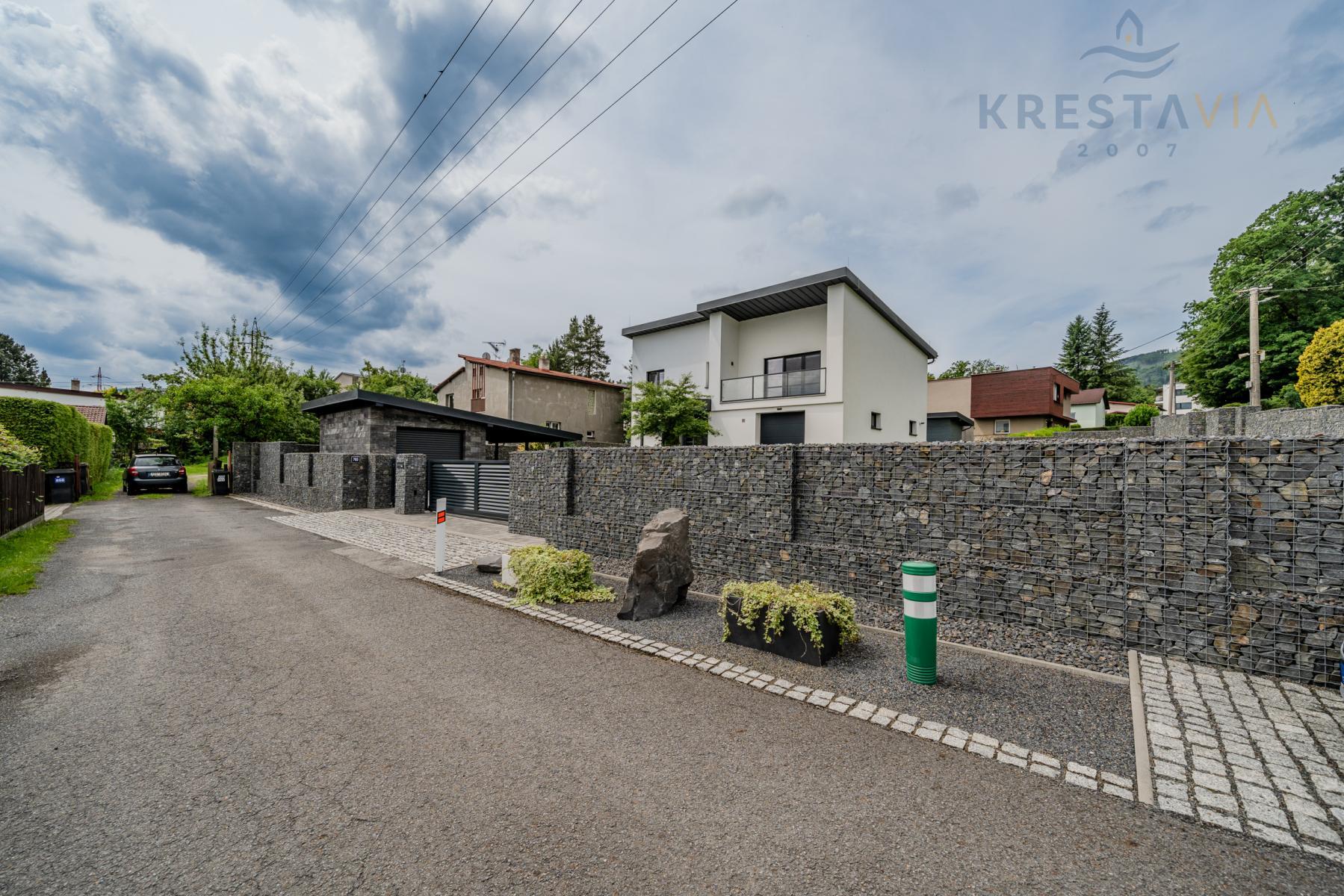 - Vysoký gabionový plot zajišťující soukromí.