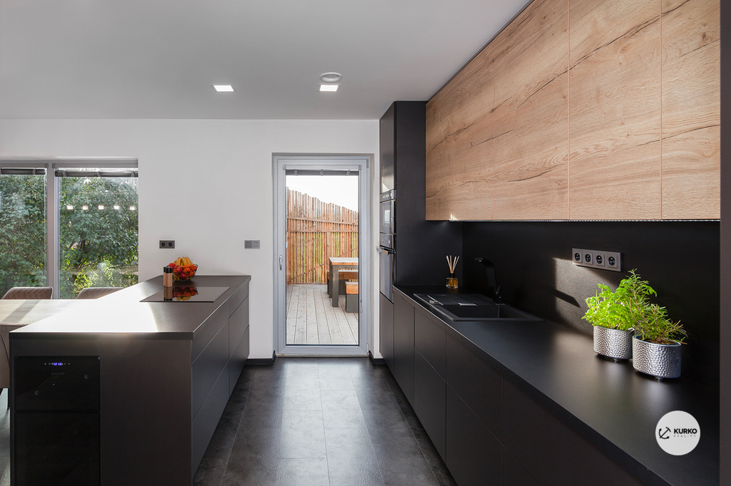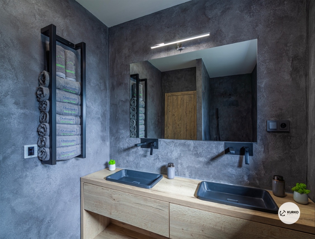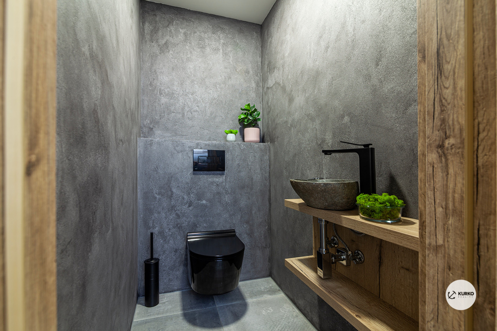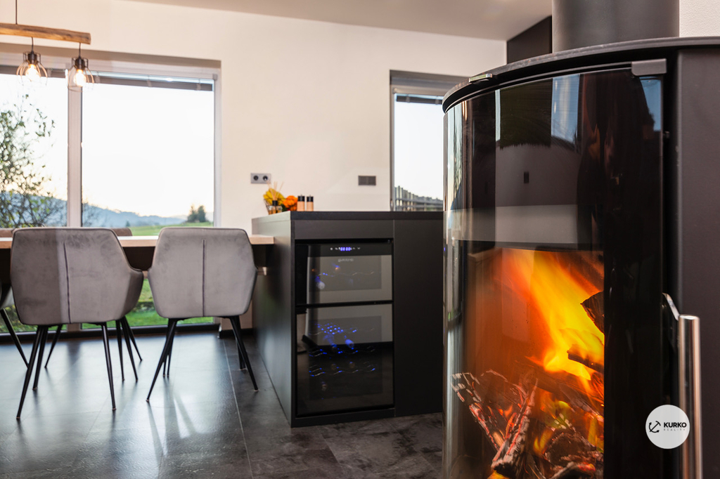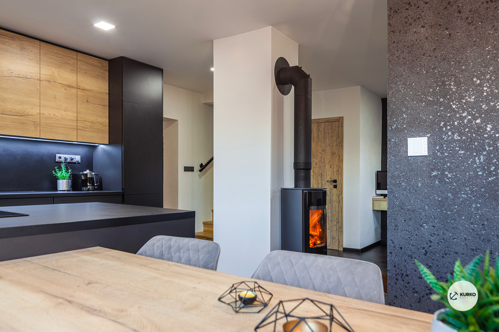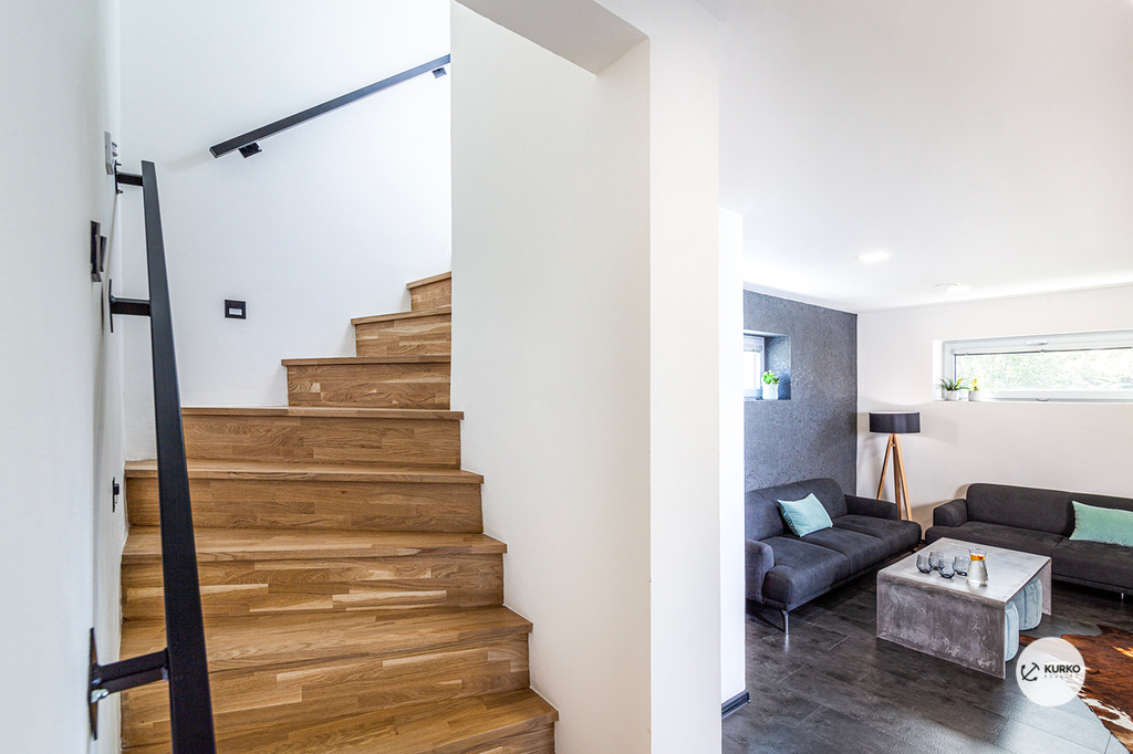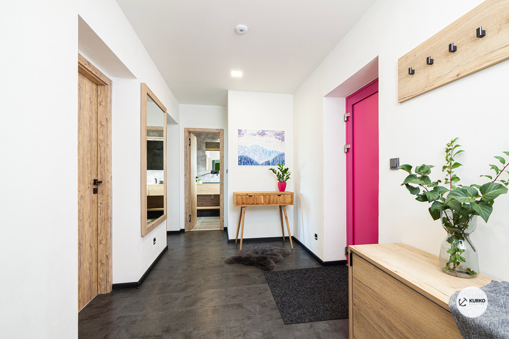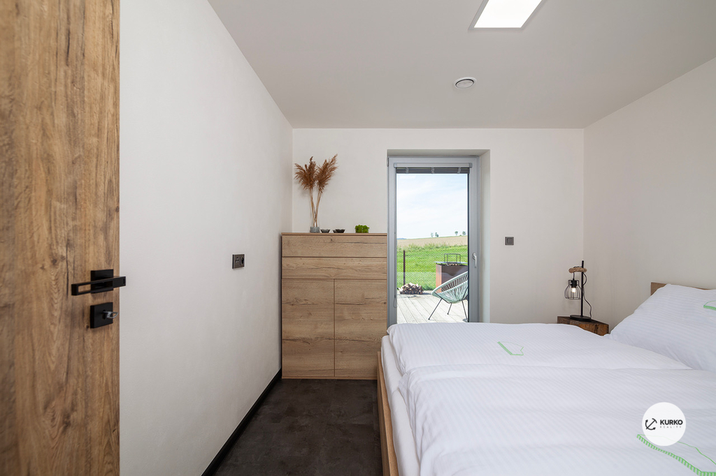 V přízemí se nachází zádveří, 2 ložnice s manželskou postelí a přímým vstupem na terasu, obývací pokoj s kuchyňským koutem, designová koupelna s prostorným sprchovým koutem a dvěma umyvadly. V obývací části je příjemné posezení s krbem a velkou televizí. Na kuchyňský kout navazuje prostorný stůl, u kterého se může pohodlně usadit až osm osob. Součástí kuchyně jsou vestavné spotřebiče a vinotéka.