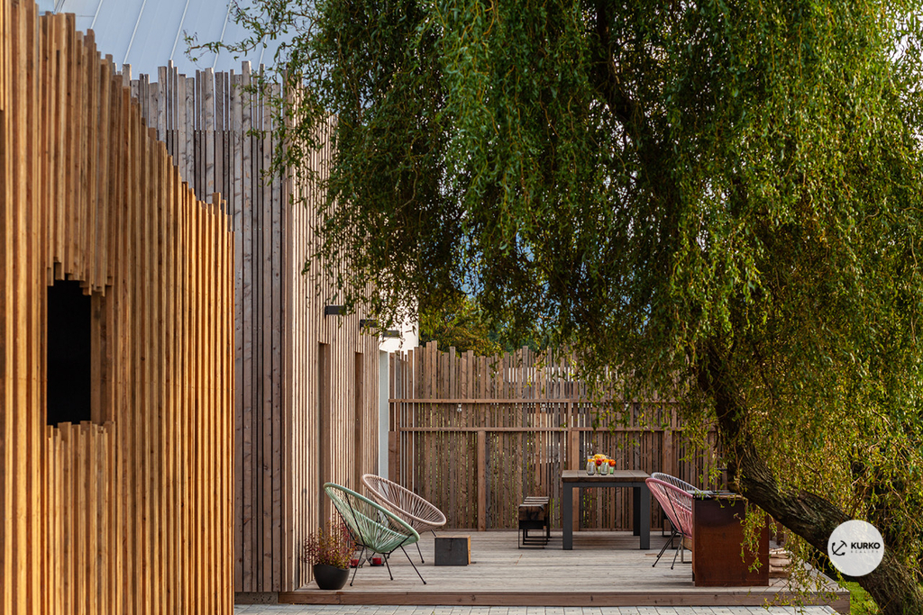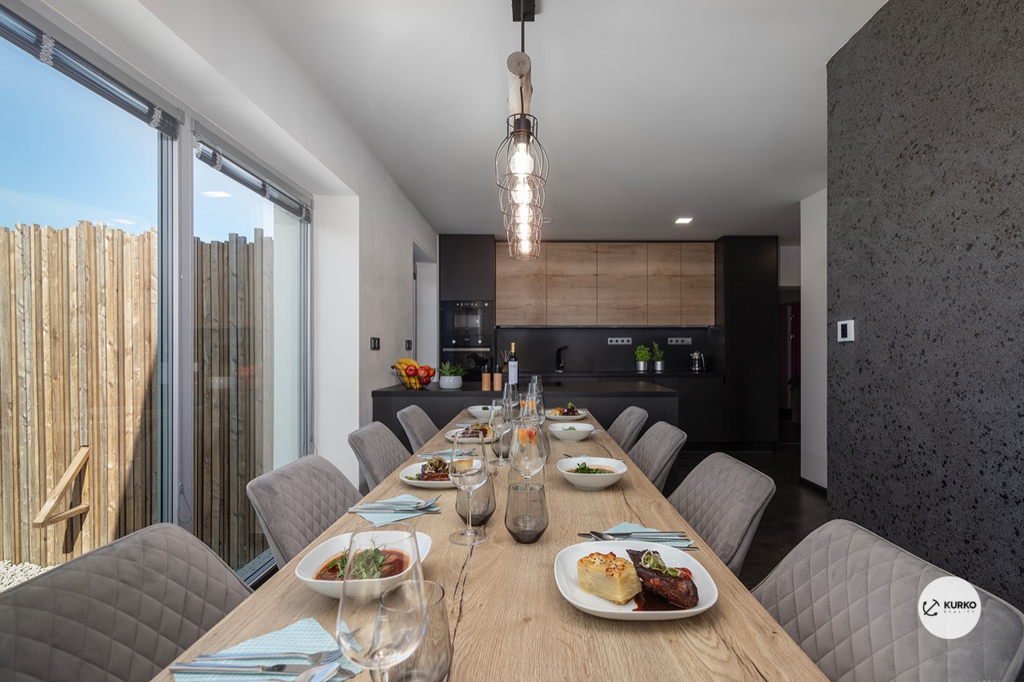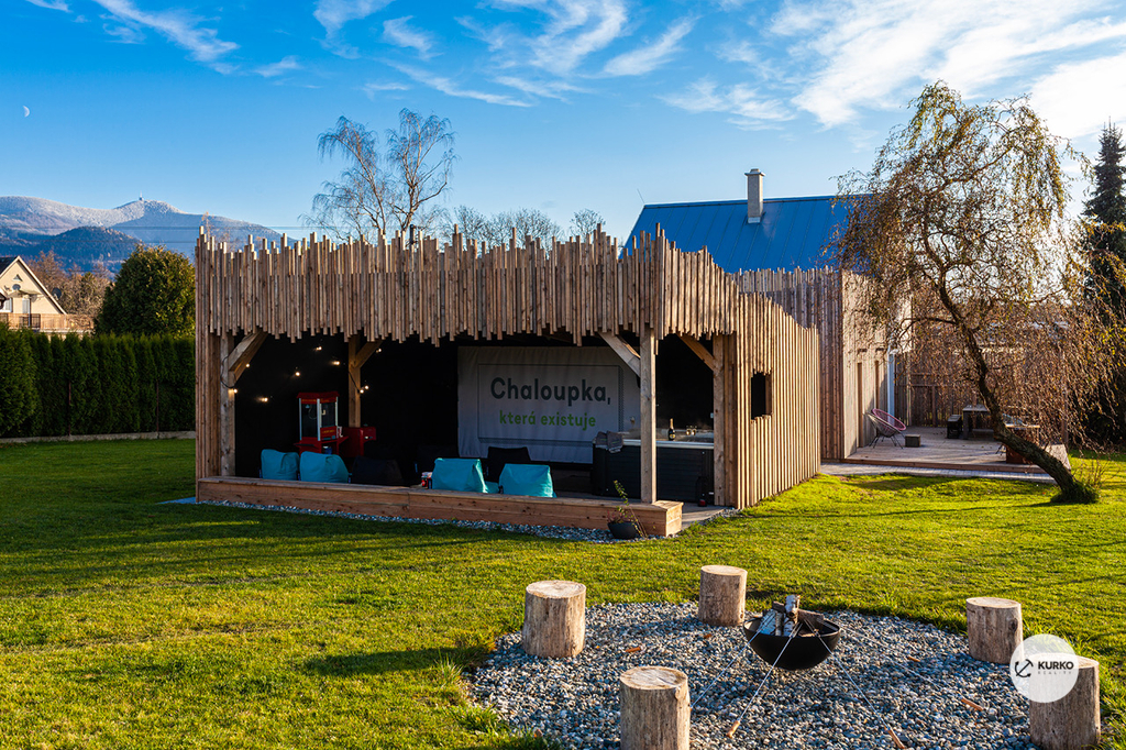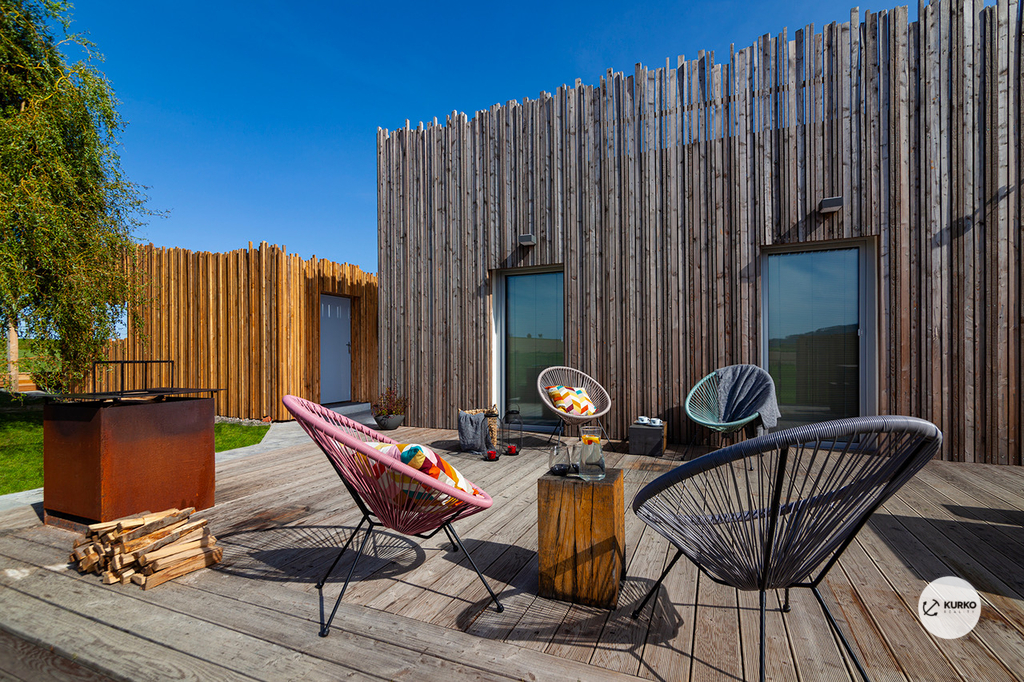 Z kuchyně a přízemních ložnic je přímý vstup na velkou terasu, kde je velký stůl, gril a zejména luxusní vířivka, plně vybavené letní kino s kvalitním plátnem, ozvučením k poslechu oblíbené hudby a sledování filmů. Pro ještě lepší zážitek jsou připraveny pohodlné sedačky, stroj na výrobu popcornu a lednice.