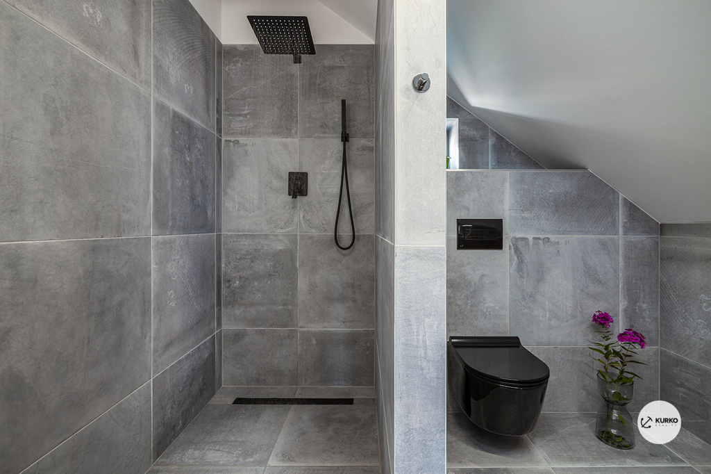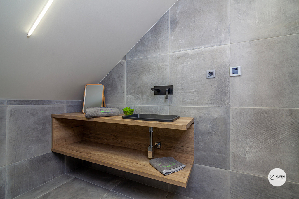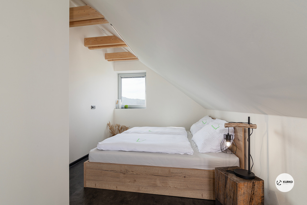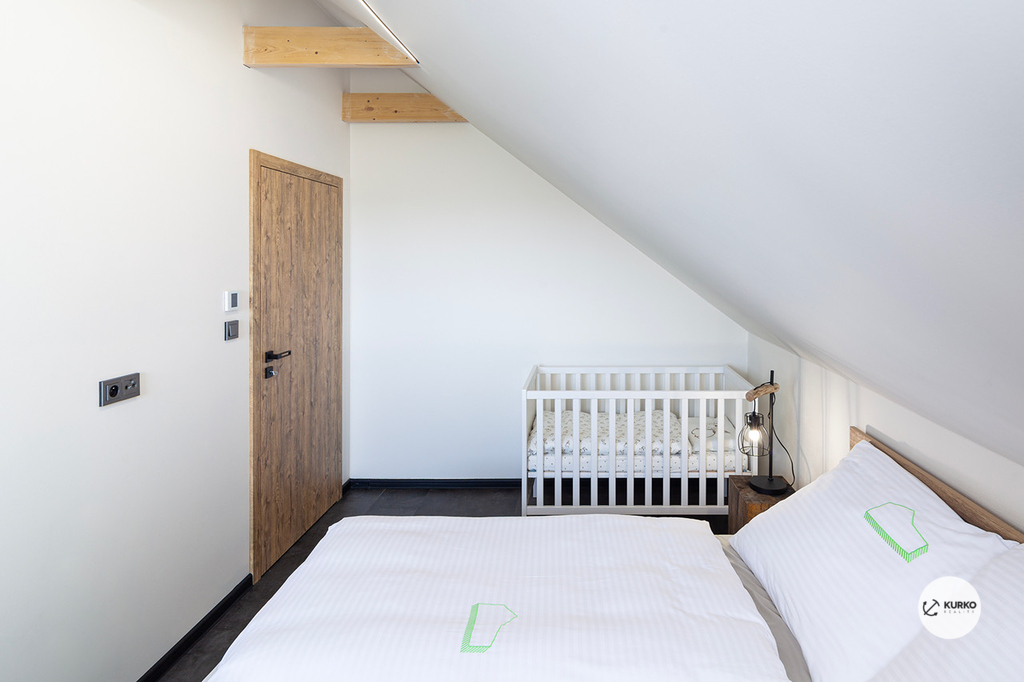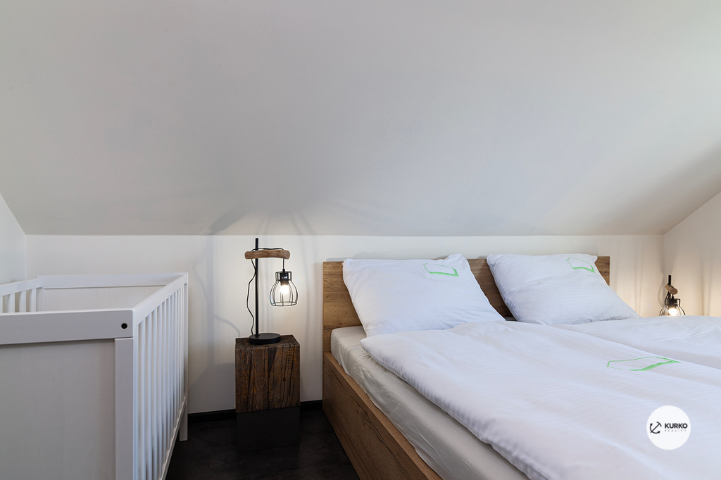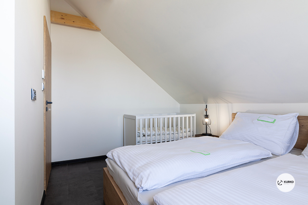 V patře jsou další dvě ložnice. V první je manželská postel a dětská postýlka, ve druhé z nich najde pohodlí až 4členná rodina. Tyto dvě ložnice mají k dispozici koupelnu se sprchovým koutem, umyvadlem a toaletou.