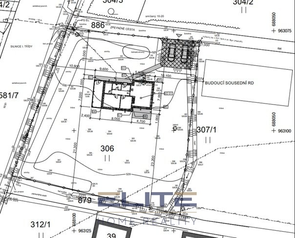 Pro lepší představu přikládám fotky s vizualizací budoucího domu na pozemku a výřez z koordinačního výkresu.