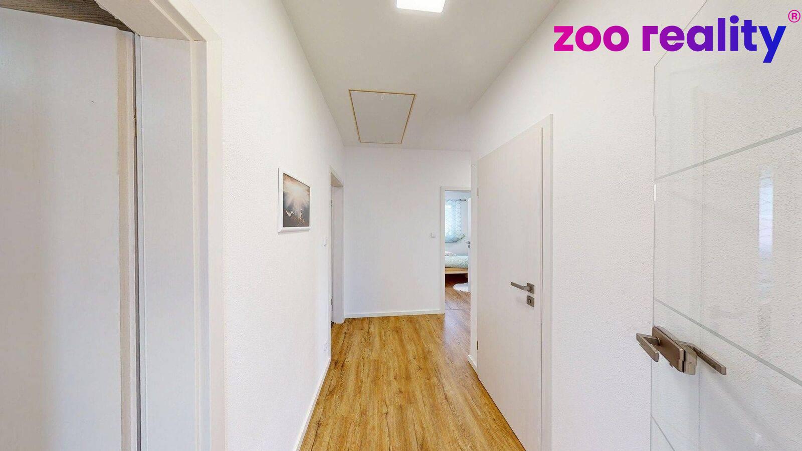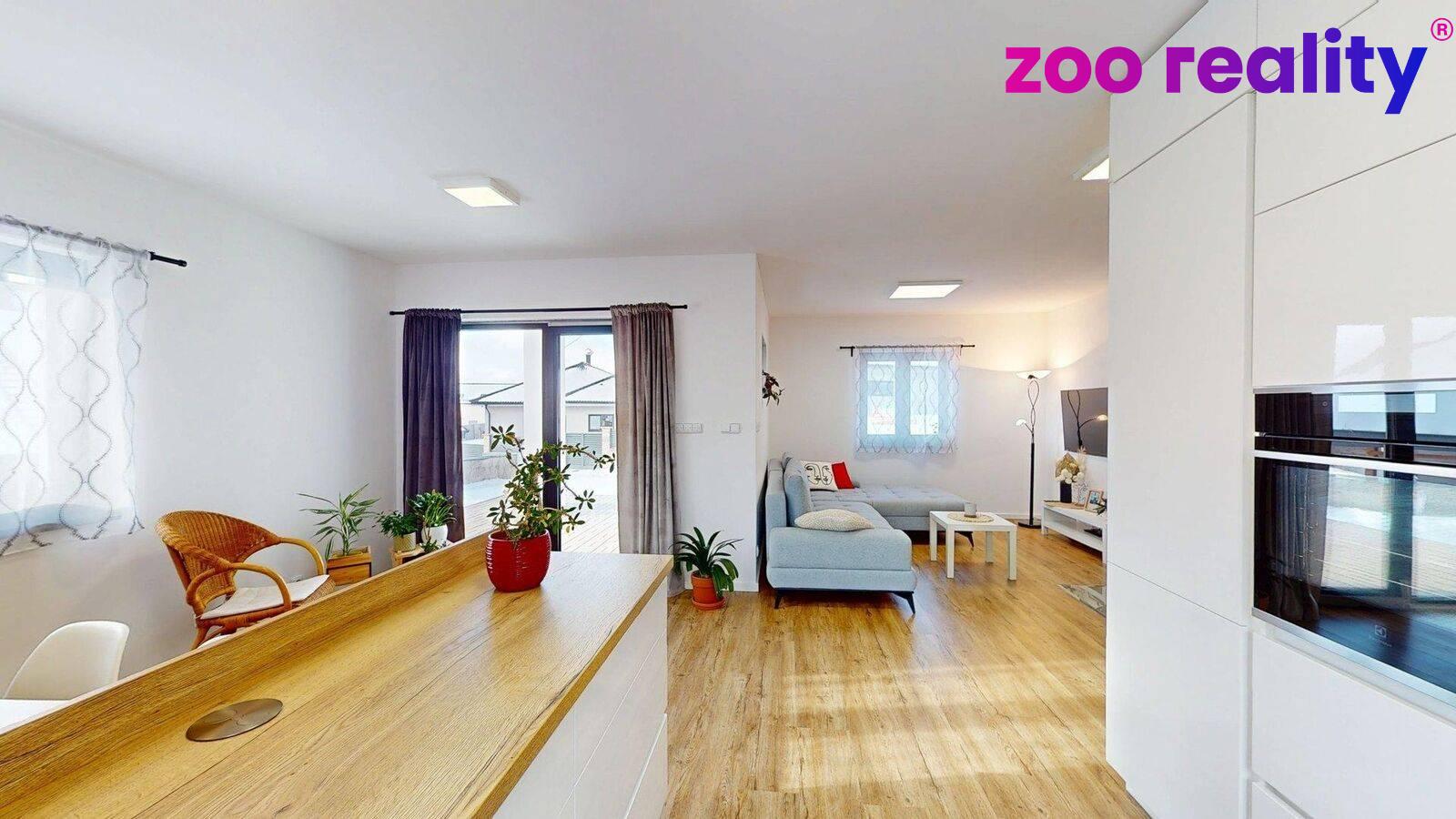 Dům s užitnou plochou 120 m² o dispozici 3+kk zahrnuje prostorný obývací pokoj propojený s jídelním koutem a kuchyní. Dále pak ložnici, která nabízí i komfort navazující koupelny a šatny. Následně pokoj, koupelnu, samostatné WC, praktickou spíž a technickou místnost. K dispozici je i půda jakožto úložný prostor.